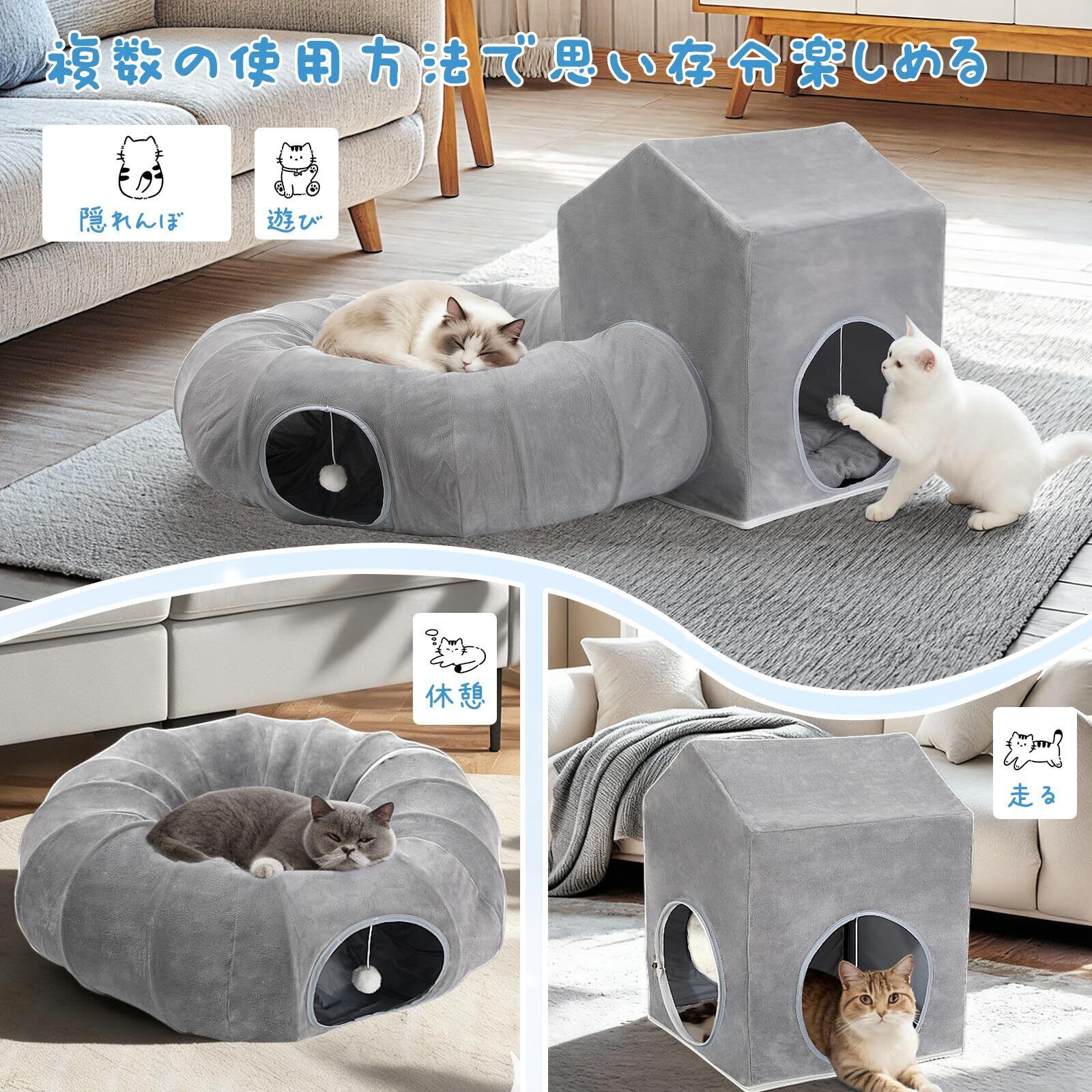 猫 ハウス 冬 トンネル付き 猫用ベッド Pawaboo キャットハウス ボール付き ふわふわ トンネル 柔軟 キャットベッド 折り畳める室内用 猫 ベッド ドーム 猫の遊び場 退屈解消 多頭飼育 休憩所 隠れ家 取り外せる 洗える 滑り止め 組立簡単 お手入れ簡単 子犬 うさぎ フェレット Gray