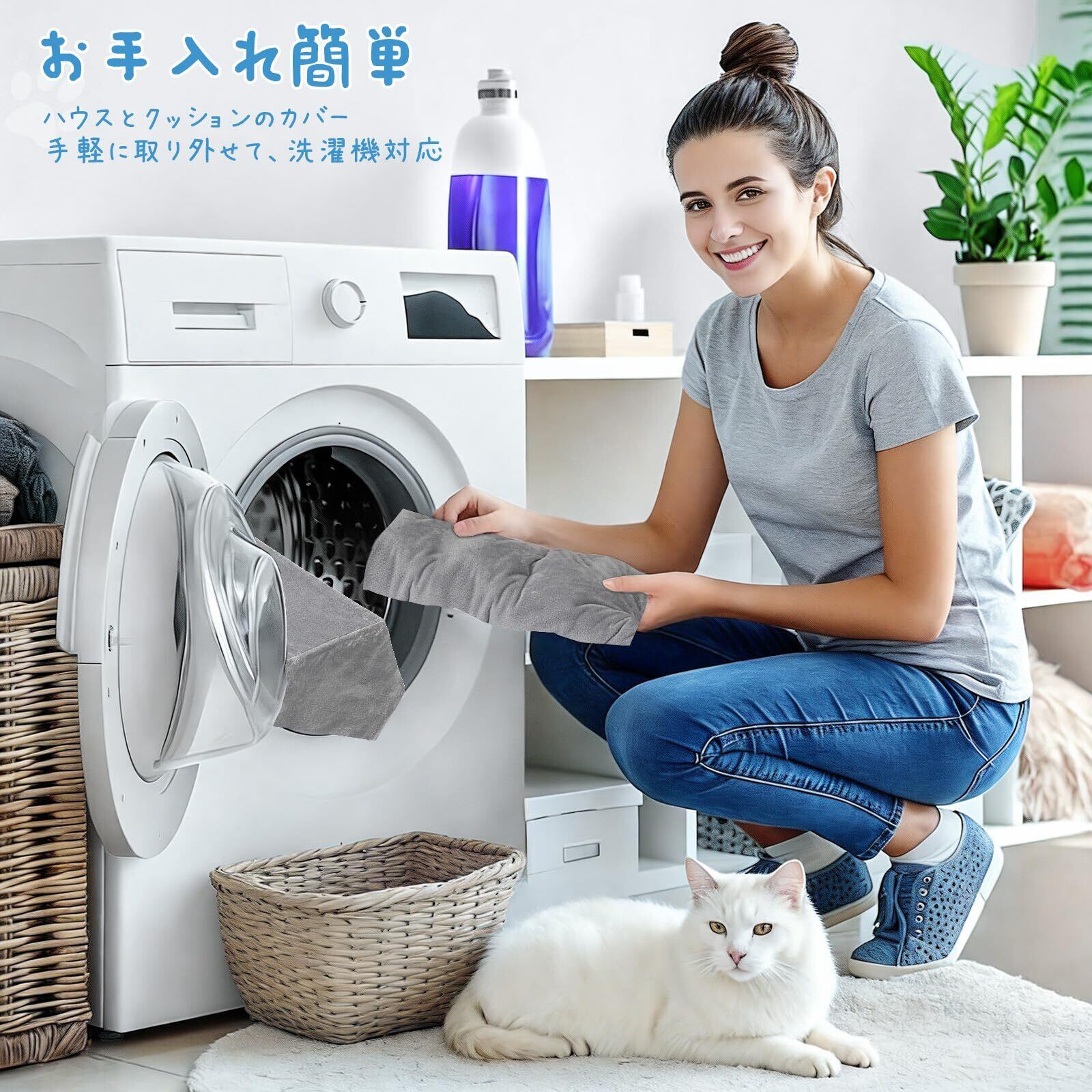 「取り外せて水洗い可能」 猫用品で気になる抜け毛やホコリ、においなどの衛生面もこれで解決。布製のカバー部分は全て簡単に取り外して丸洗い可能です。小屋の外カバー、クッションカバーまで、洗えるので常に清潔な状態を保てます。面倒な細かい手入れは必要なく、洗濯機でサッと水洗いできるので、忙しい飼い主様にもぴったりです。ご注意:トンネルの部分のカバーは取り外せない仕様のため、日常のお手入れ時は、コロコロで抜け毛取ったり、よく絞った布巾で汚れを拭き取ることをおすすめします。