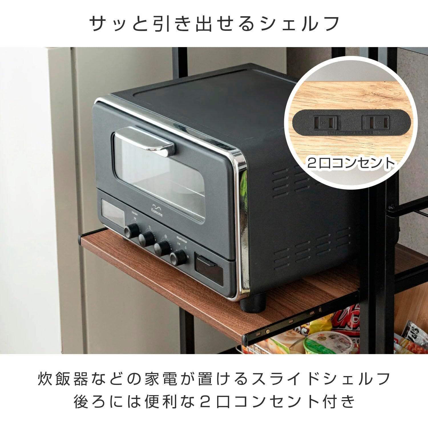 炊飯器やトースターの使用時に、手前に引き出して使えるスライド棚を搭載。使わない時はスッキリ収納。