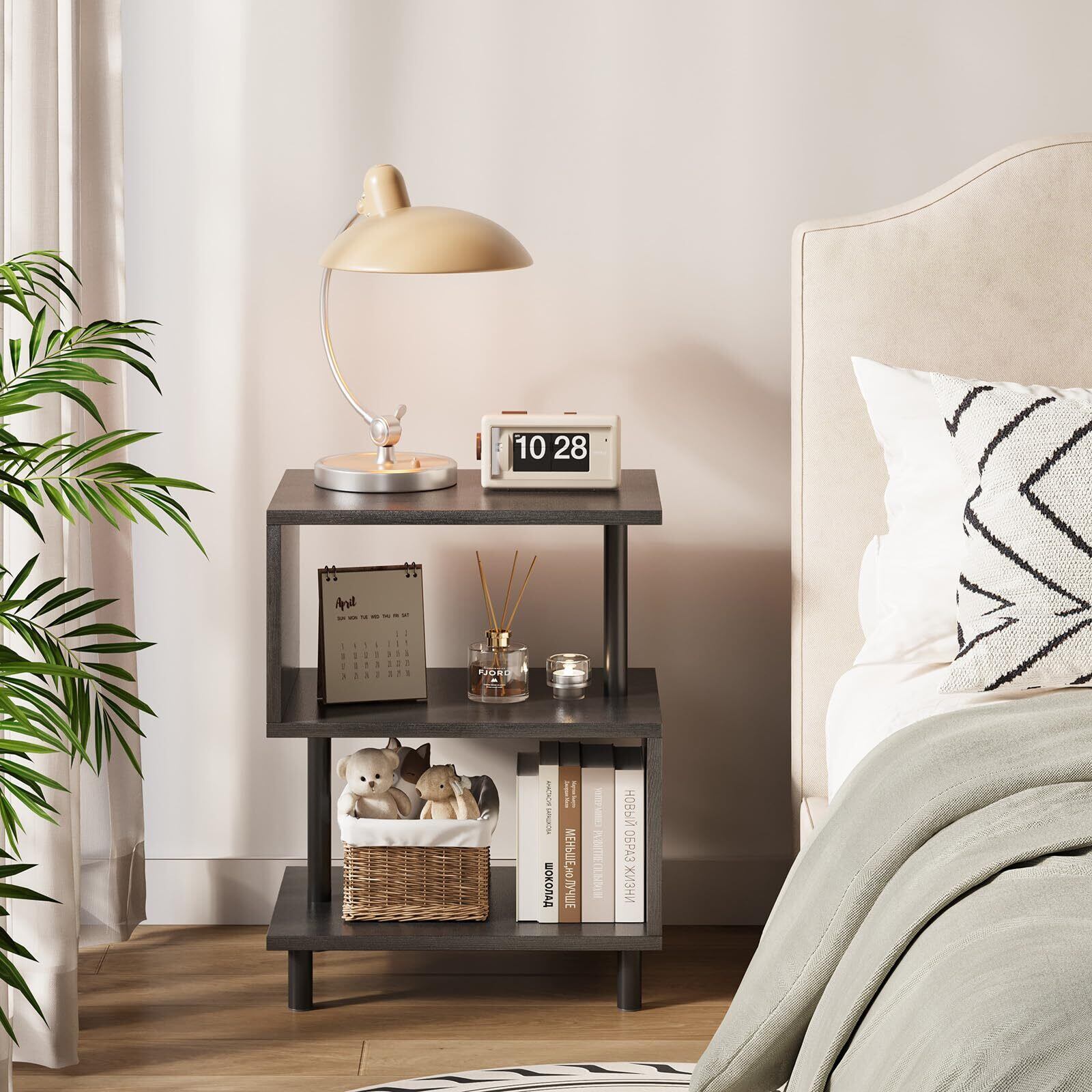 APICIZON サイドテーブル S字 ラック 3段 オープンラック 小さい オープンシェルフ 木目調 ナイトテーブル スリム ベッドサイドテーブル リビング ソファサイド 収納 棚 おしゃれ 北欧 モダン (40cm*30cm*51cm、ブラック)