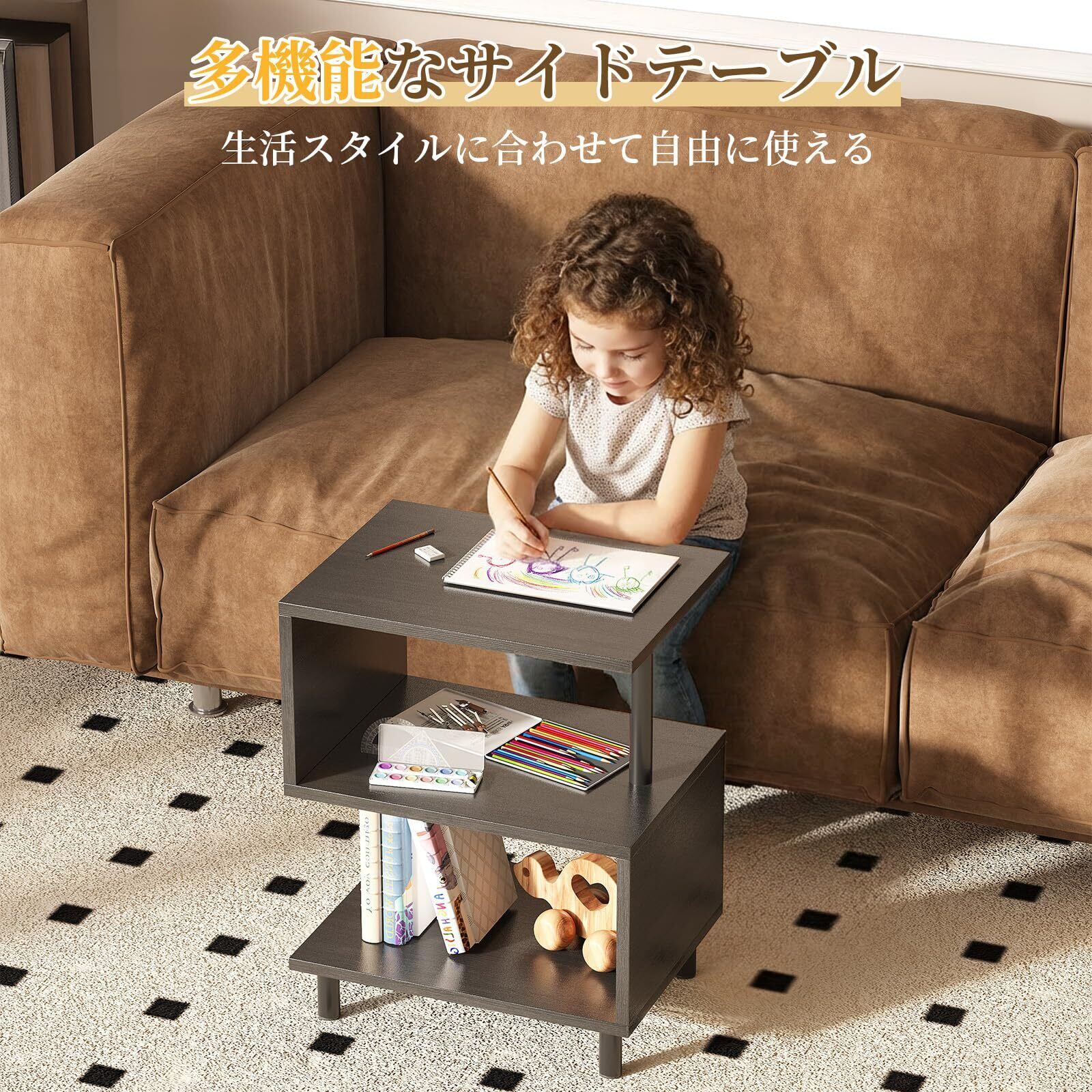 【サイドテーブルとして多機能】 高いデザイン性と収納力を兼ね備えたサイドテーブルです。おしゃれなS字型デザインで、北欧、モダンなど様々なインテリアに調和します。リビングのソファサイド、寝室のナイトテーブル、玄関のディスプレイラックなど、収納力满分なオープンラックとして幅広く活躍します。