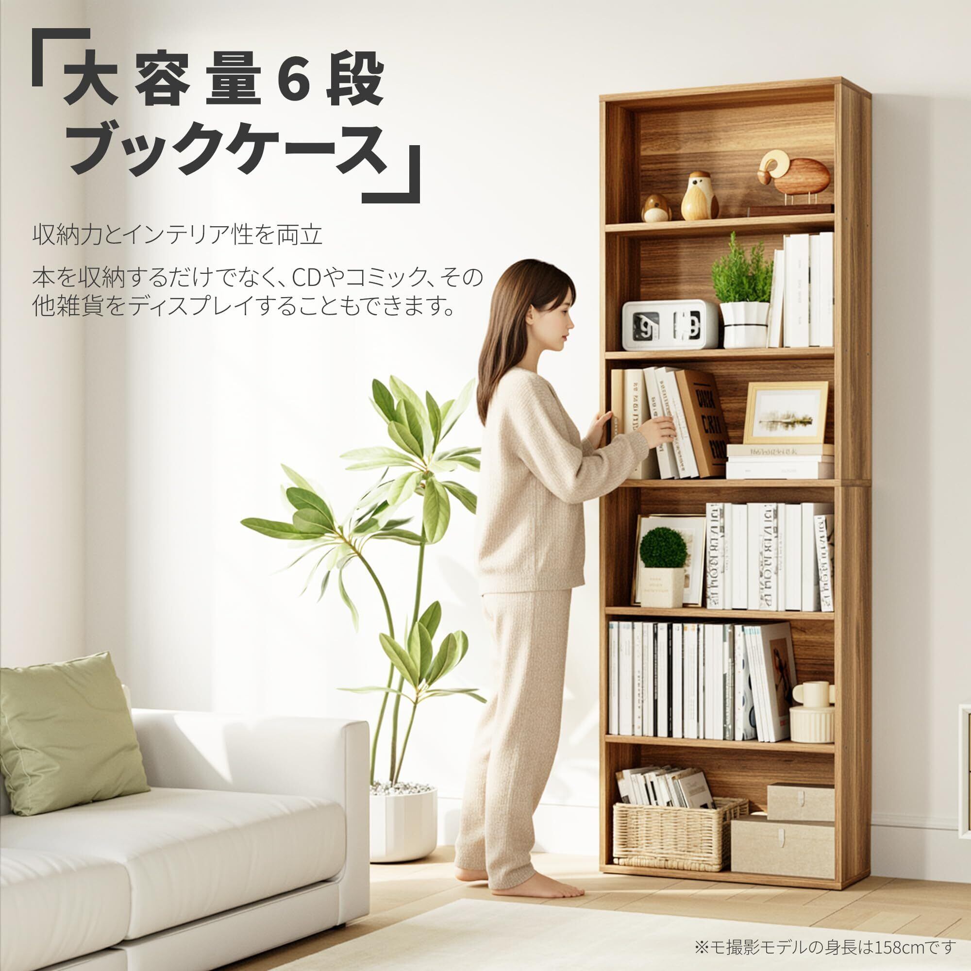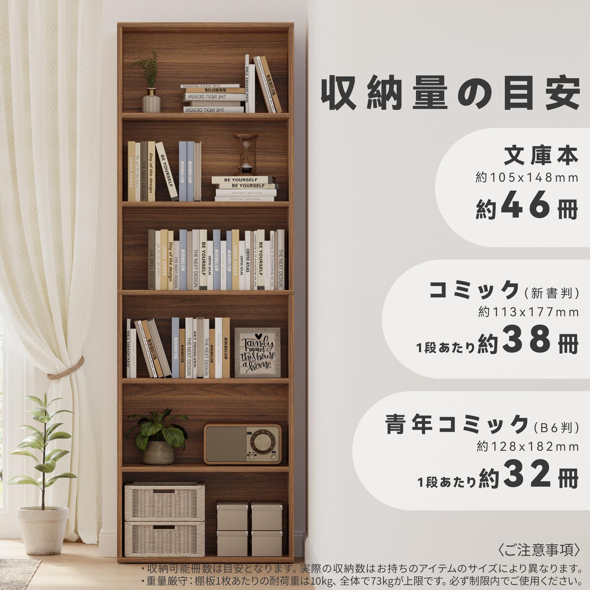 スリムで大容量設計: 幅60×奥行23.5×高さ180cmのコンパクトな6段構成で、限られたスペースでも文庫本から雑誌、漫画、CD、DVDまで大量に収納可能