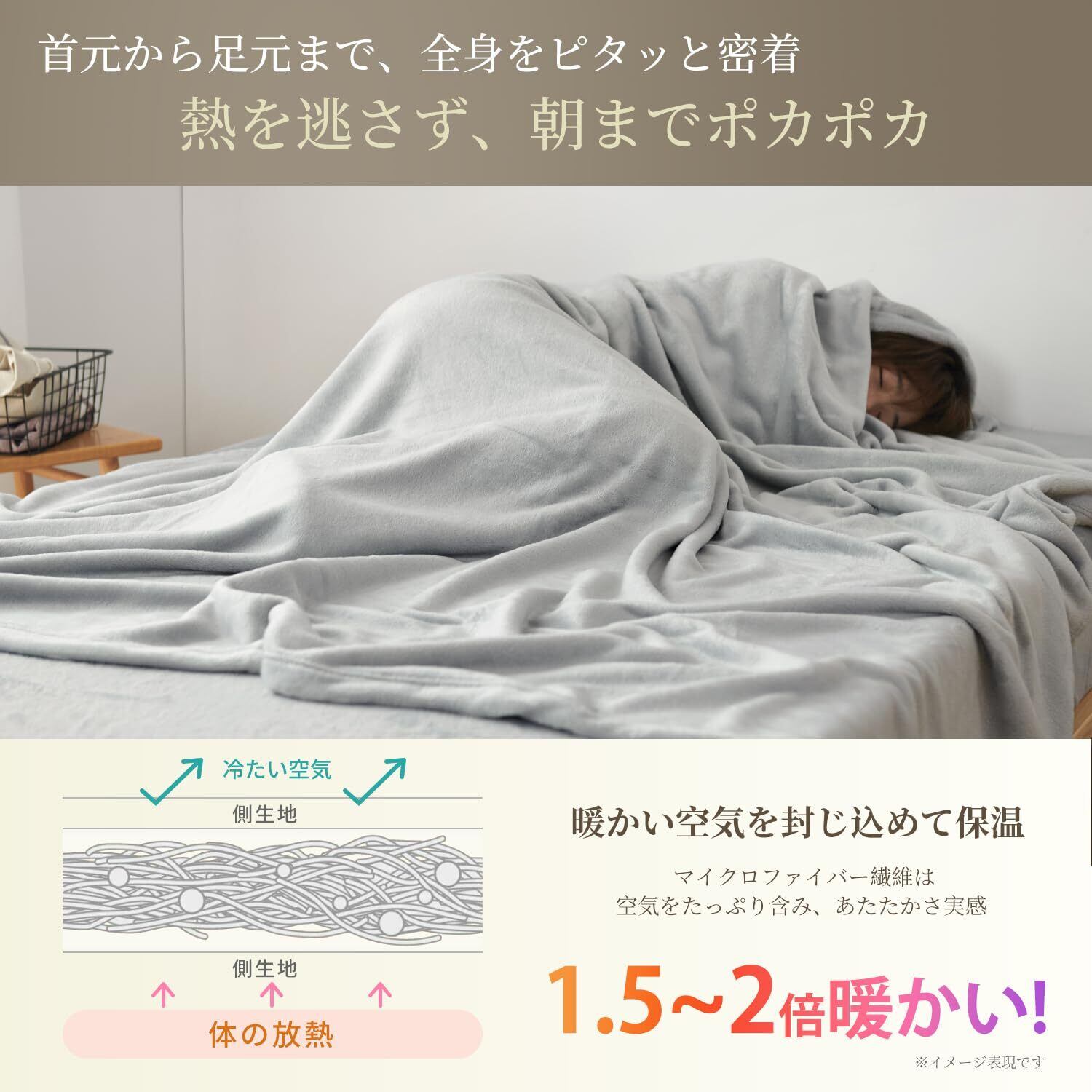 「+30cm超ロング設計で足先までしっかり包む」:通常の毛布より約30cm長い「超ロングサイズ」。寝返りをしても足先が出にくく、つま先から肩口まで全身をすっぽり包み込みます。冷えやすい冬の夜も、朝までぽかぽか快適にお休みいただけます。