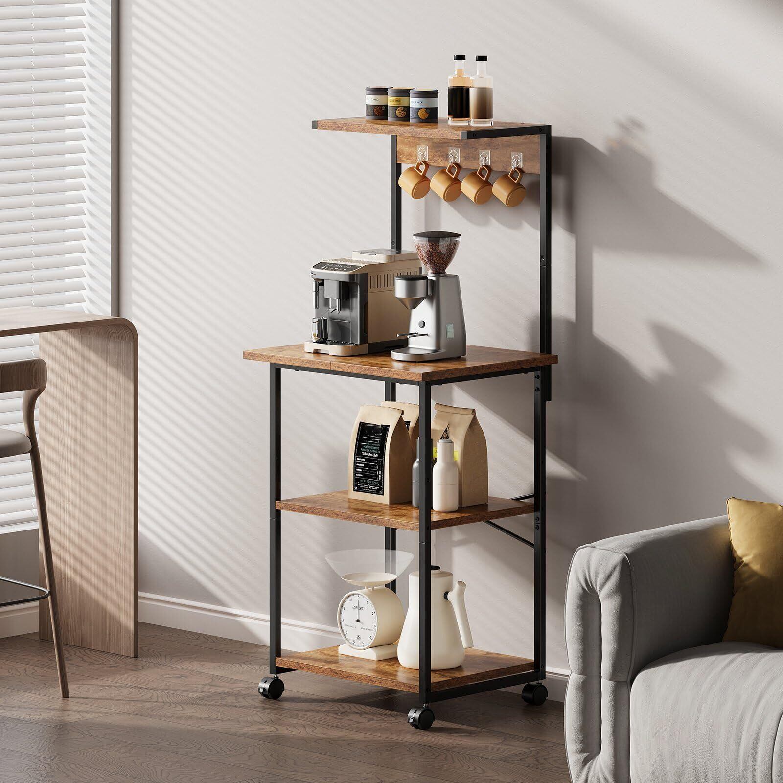 レンジラック キッチンラック レンジ台 キャスター付き 高さ調整可動棚 レンジボード キッチン棚 電子レンジ ラック キッチン 収納 トースターラック 幅50×奥行35×高さ132cm 四つフック ビンテージ