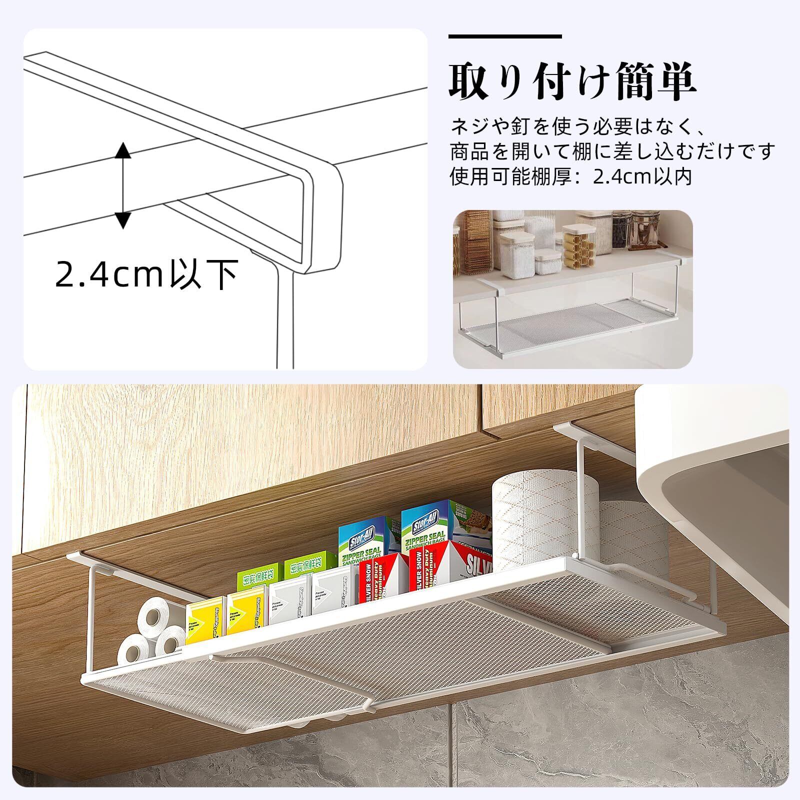 戸棚下 吊り戸棚 収納ラック 吊り下げラック 戸棚下収納ラック 吊戸棚 バスケット キッチン収納 掛け式 省スペース (ホワイト)