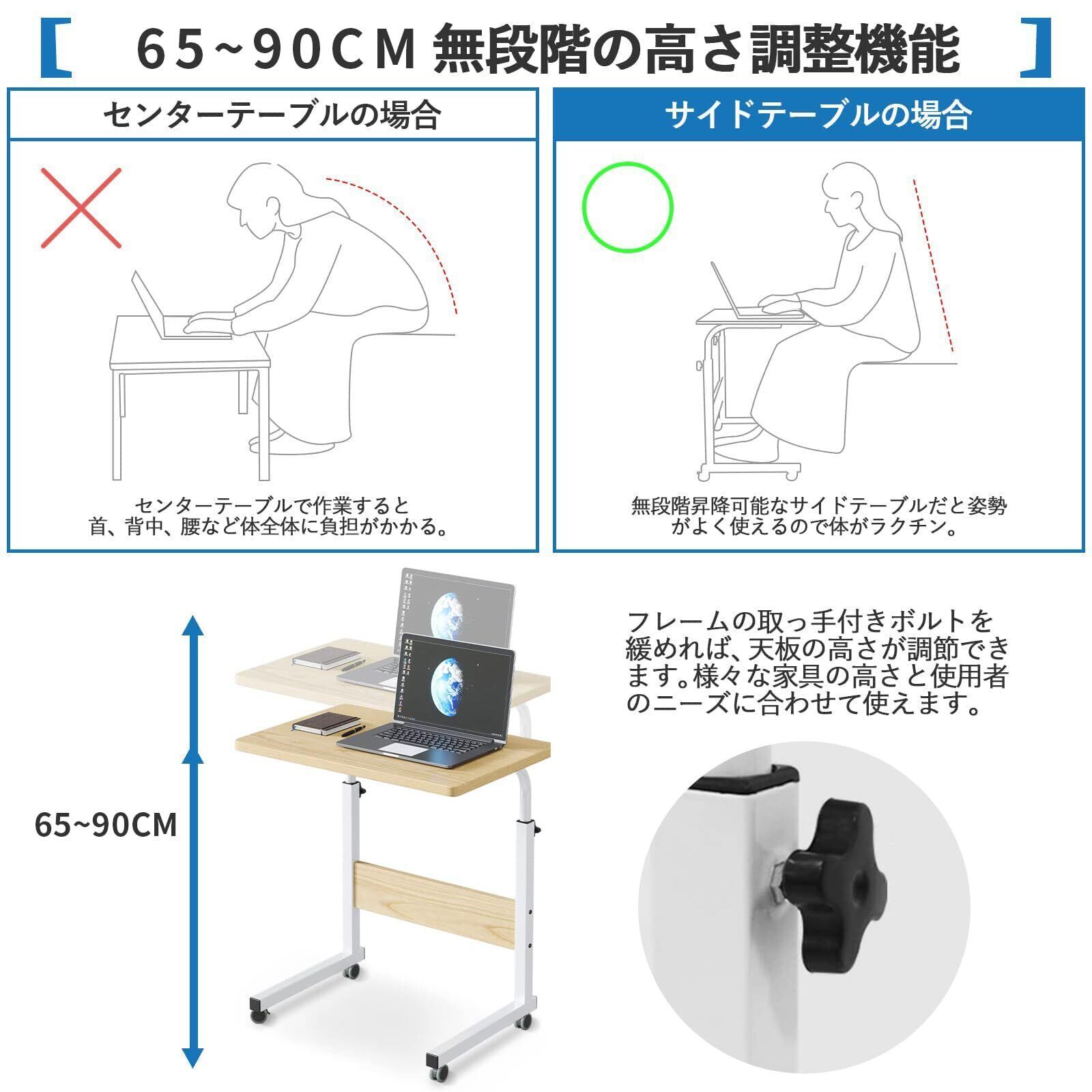 【高さ調節可能・キャスター付き】高さ65cm~90cm無段階調節可能の昇降式テーブルは、後ろ左右の取っ手付きボルトを緩めて、フレームを上下に動かすだけでいろんな家具の高さや様々なニーズに合わせて高さ調節可能になります。本製品はゴムホイールキャスターを使用し、360°回転できるため、移動が楽々でどこにでも使えます。ゴムホイールはどんな種類の床材にも移動がスムーズかつ静かで、何よりお客様の大事なフローリングが傷つけられる心配はありません。4つのキャスターともストッパー機能付きなので、不意な動きを防ぎ、安定性に優れています。注意:指でキャスターのネジをひねて、最後まで回したらレンチで固定してください