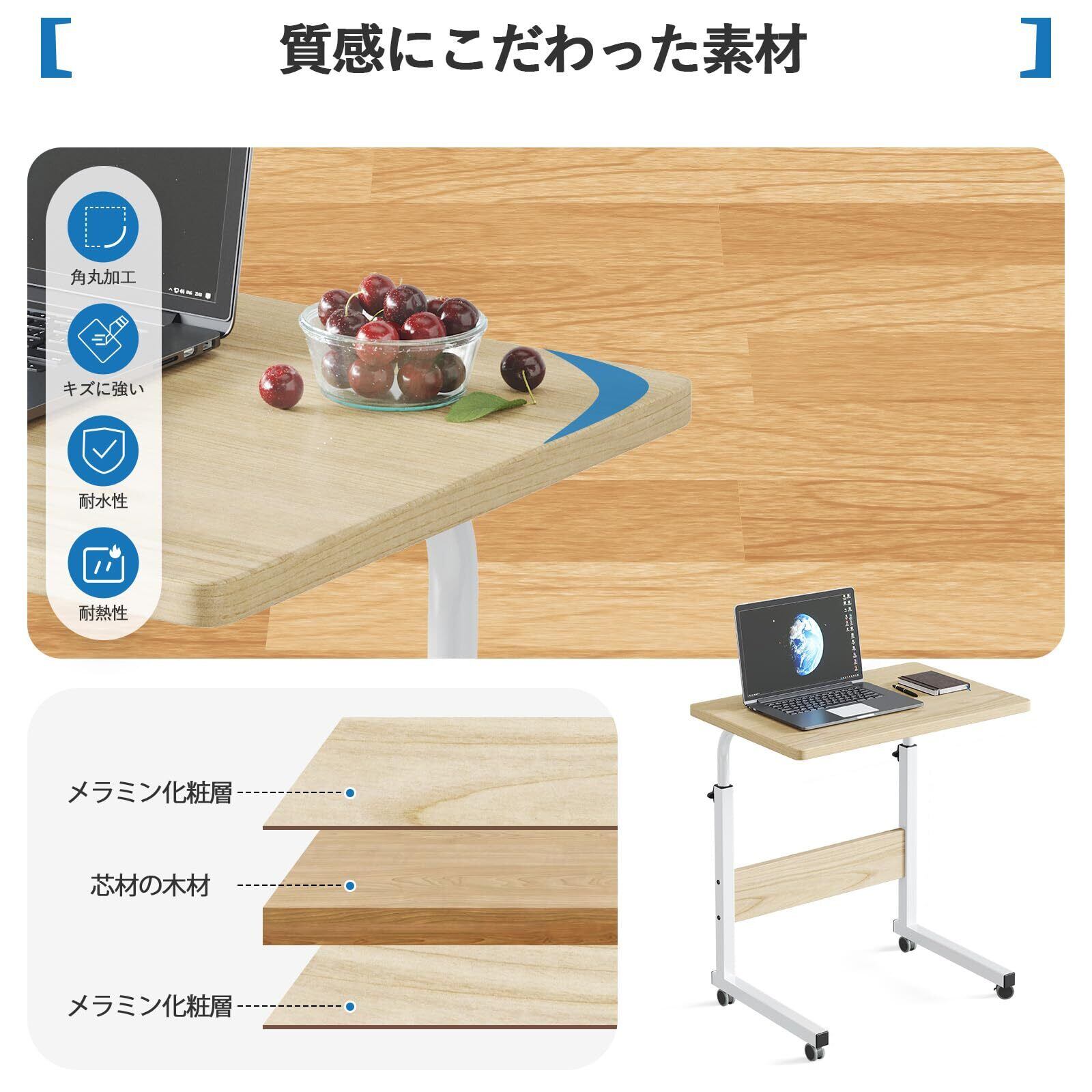 HANYEEサイドテーブル キャスター付き 高さ調節 コの字 昇降式テーブル オフィスデスク パソコン置き 勉強机 介護用 ベッドサイド用 ソファーサイド用 幅80cm×奥行40cm×高さ65~90cm 組立簡単 日本語説明書付き(ナチュラル)