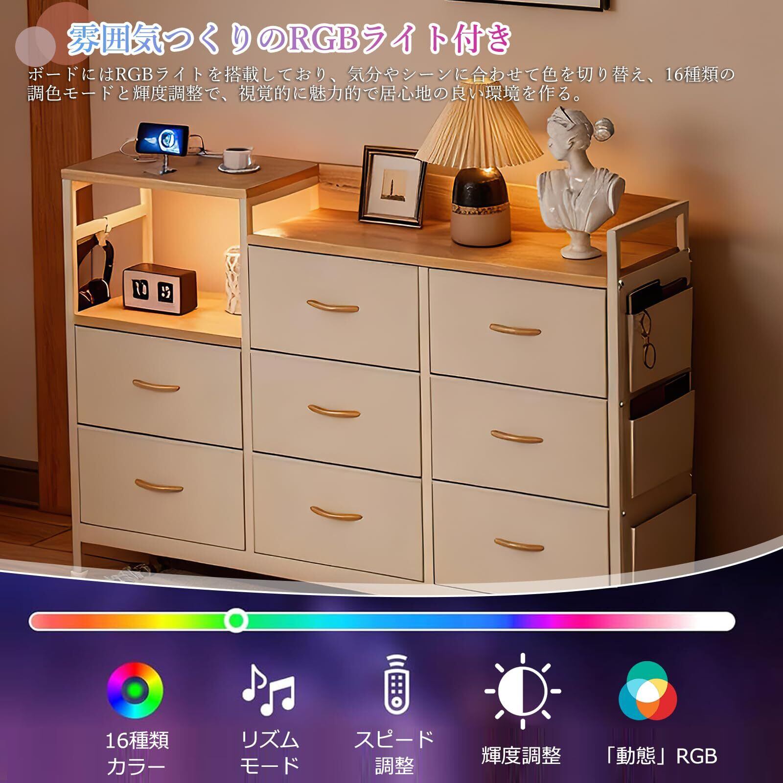 IKIFLY チェスト収納 タンス 棚付き 箪笥 リビング収納 箪笥 ワイドチェストLEDライト付きおしゃれ 収納ケース 引き出し 大容量 北欧 USBポート付き洋服タンス 布製 収納ボックス シンプル 整理タンス 寝室収納 一人暮らし3段8杯 (ベージュ)