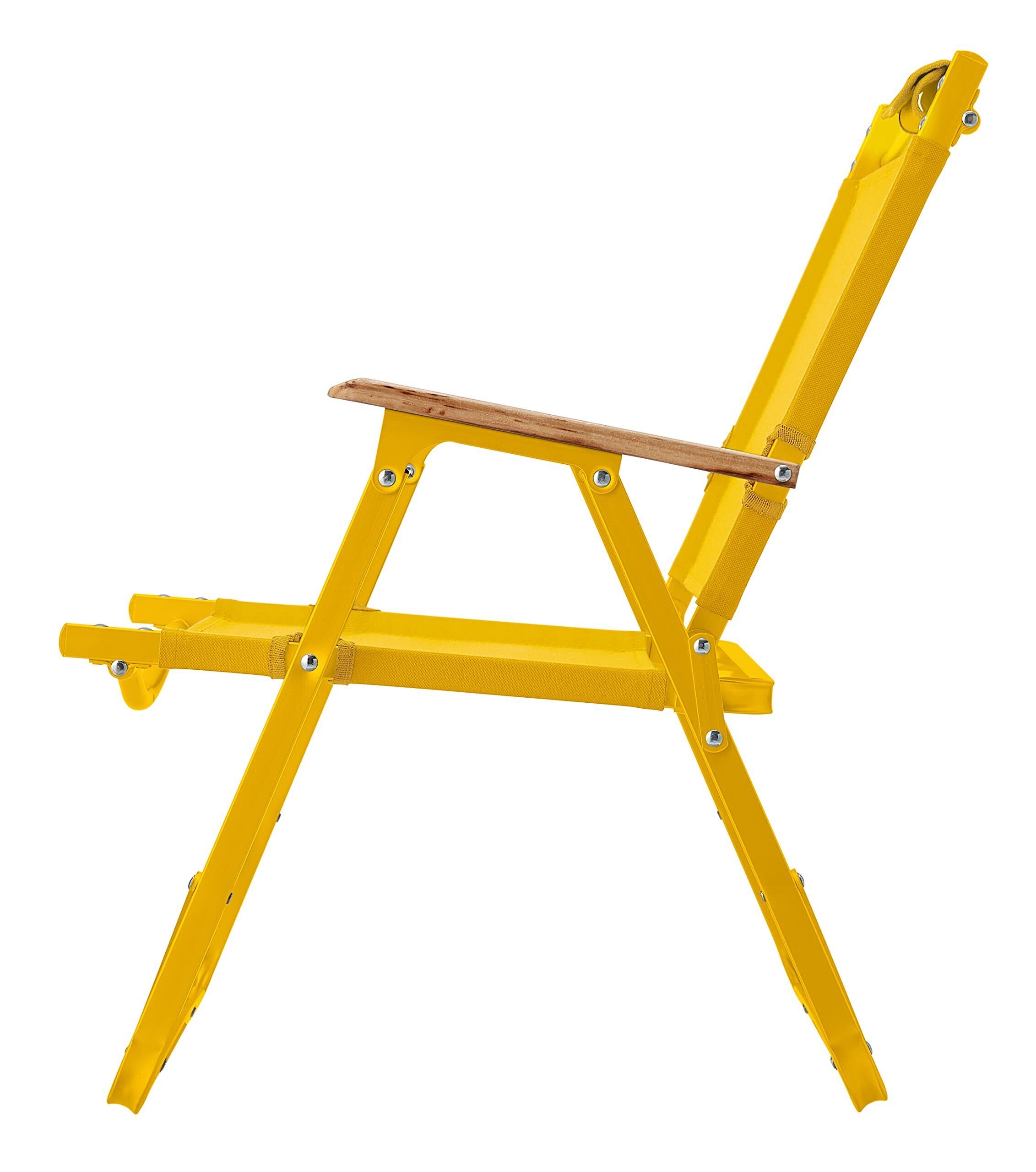 【キャンプ用椅子】燃えにくい生地で焚火シーンに最適な座り心地のいいロースタイルチェア。肌触りの良いウッドアームレスト。