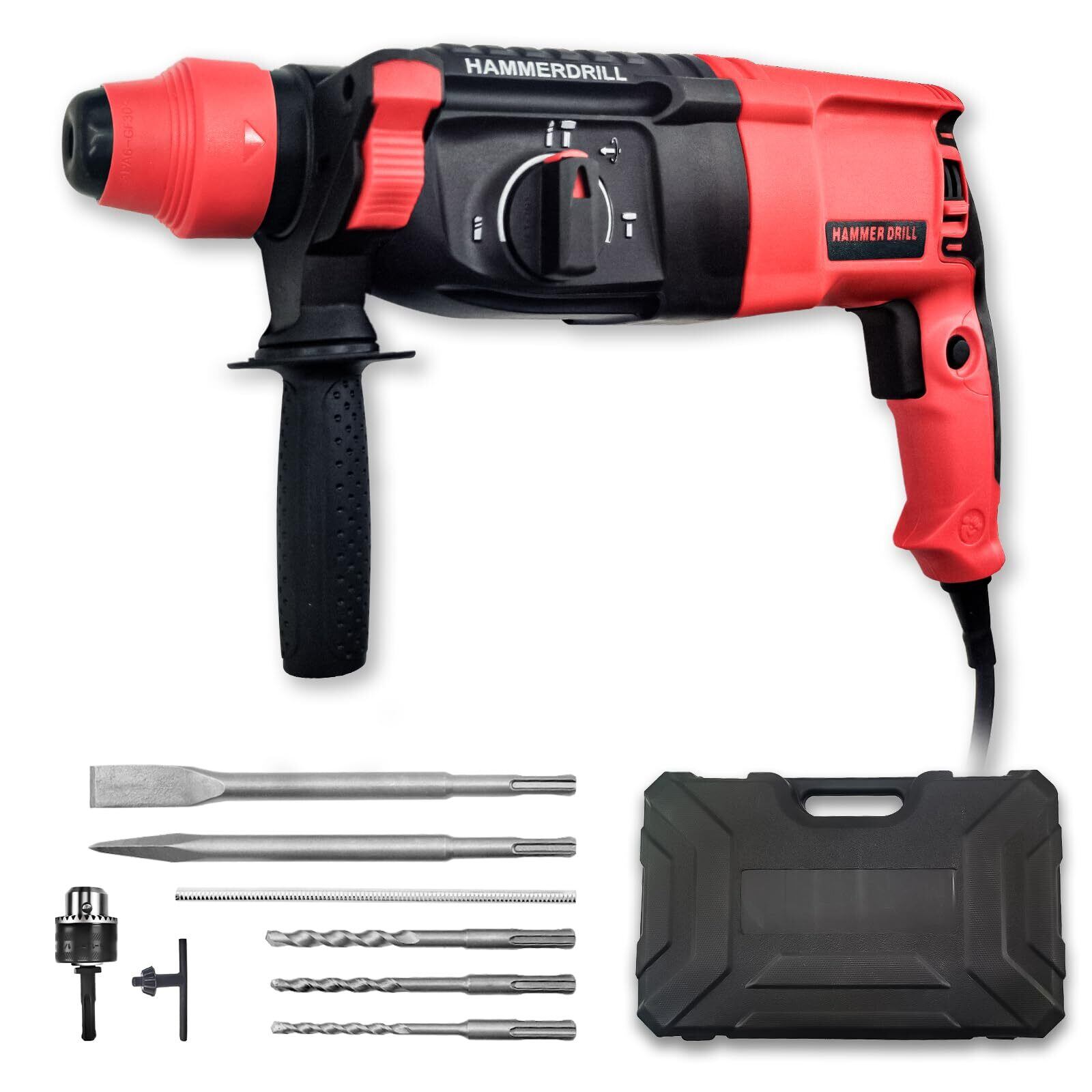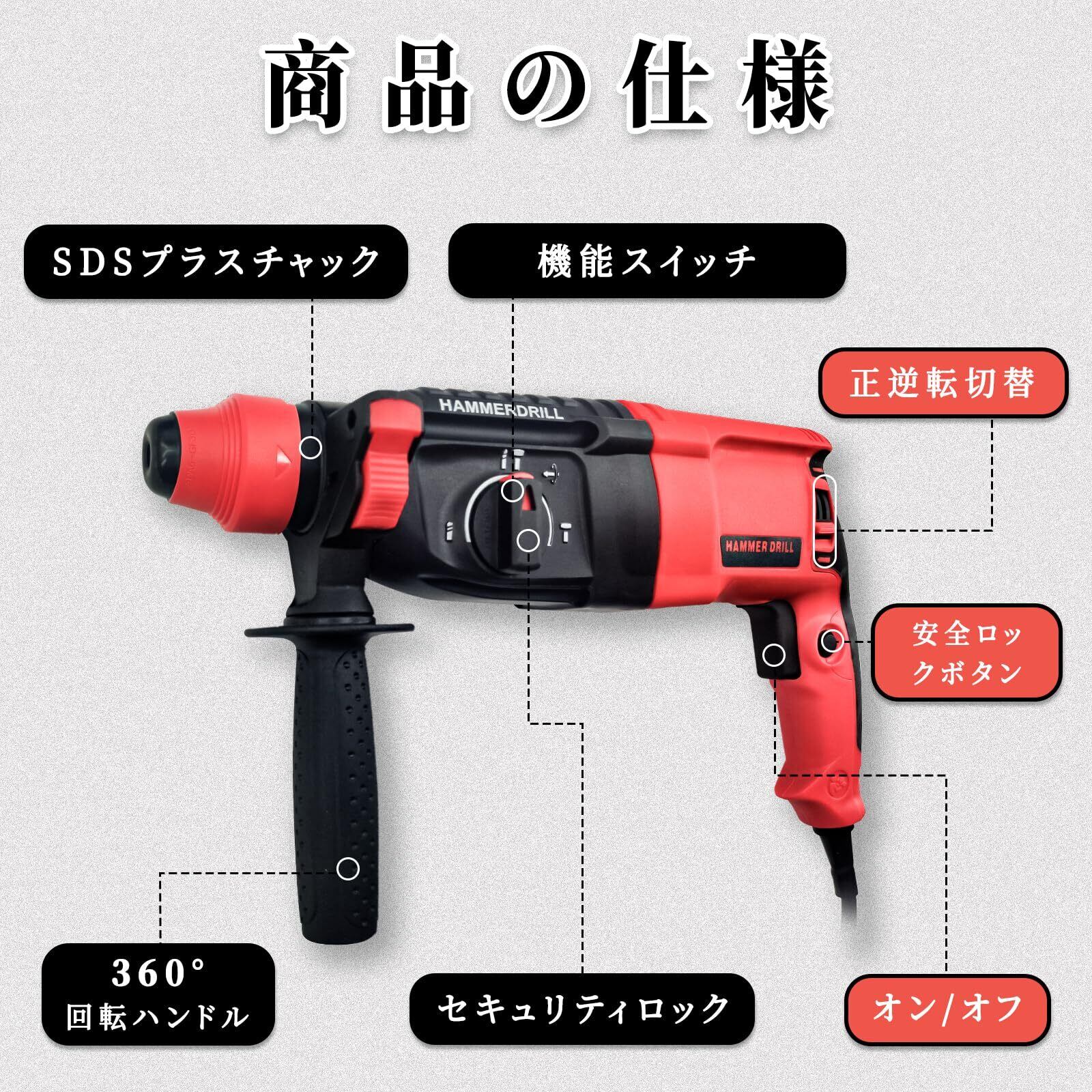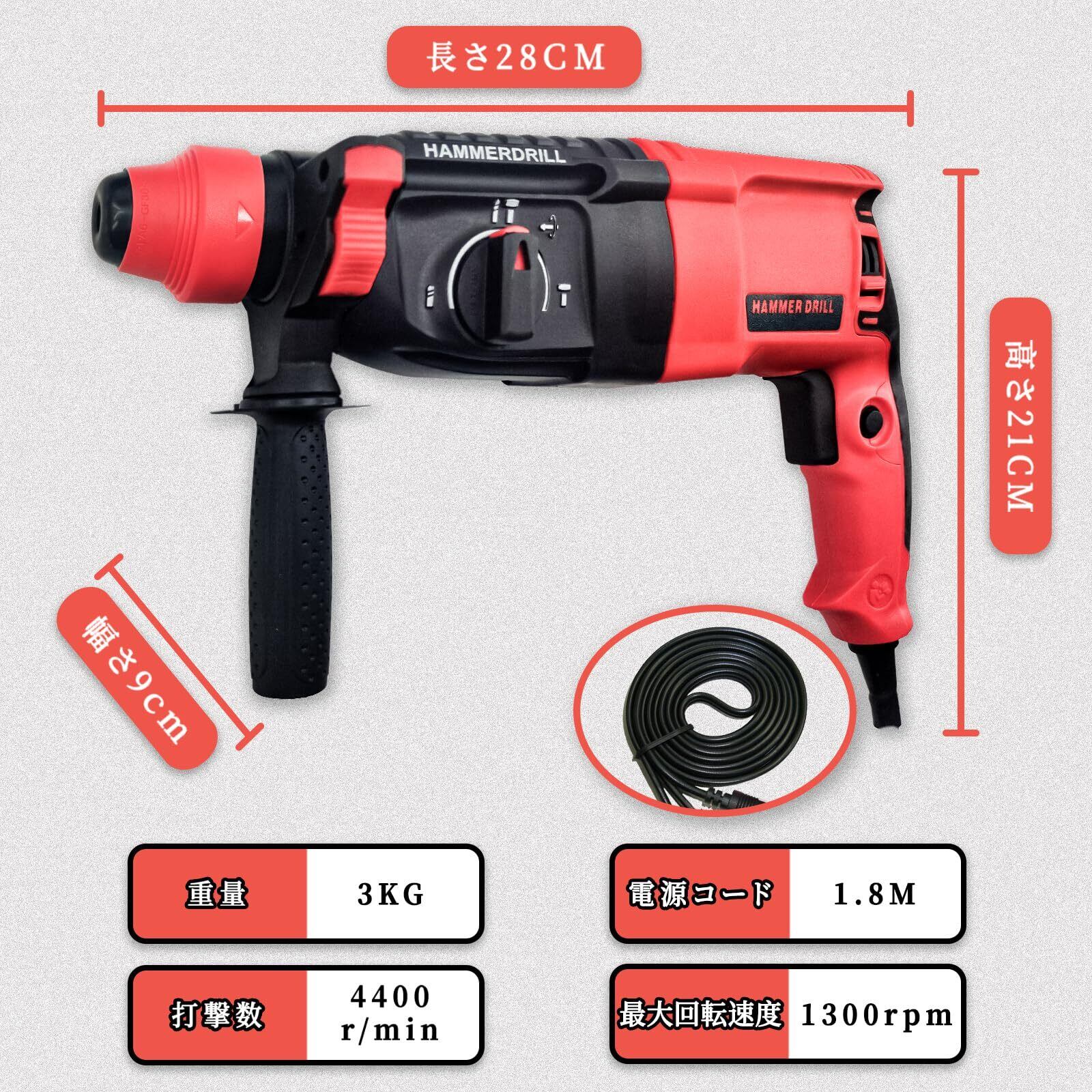 ハンマードリル 穴開け コード式 インパクトハンマー 振動ドリル SDSプラス 電動ハンマドリル 3モード 110V 1100W コンクリートφ26mm/φ金属13mm/φ木材30mm 金属 木材 石材 壁 穴あけ ハツリ 収納バッグ付き 豊富な付属品 (レッド) 日本語取扱説明書付き