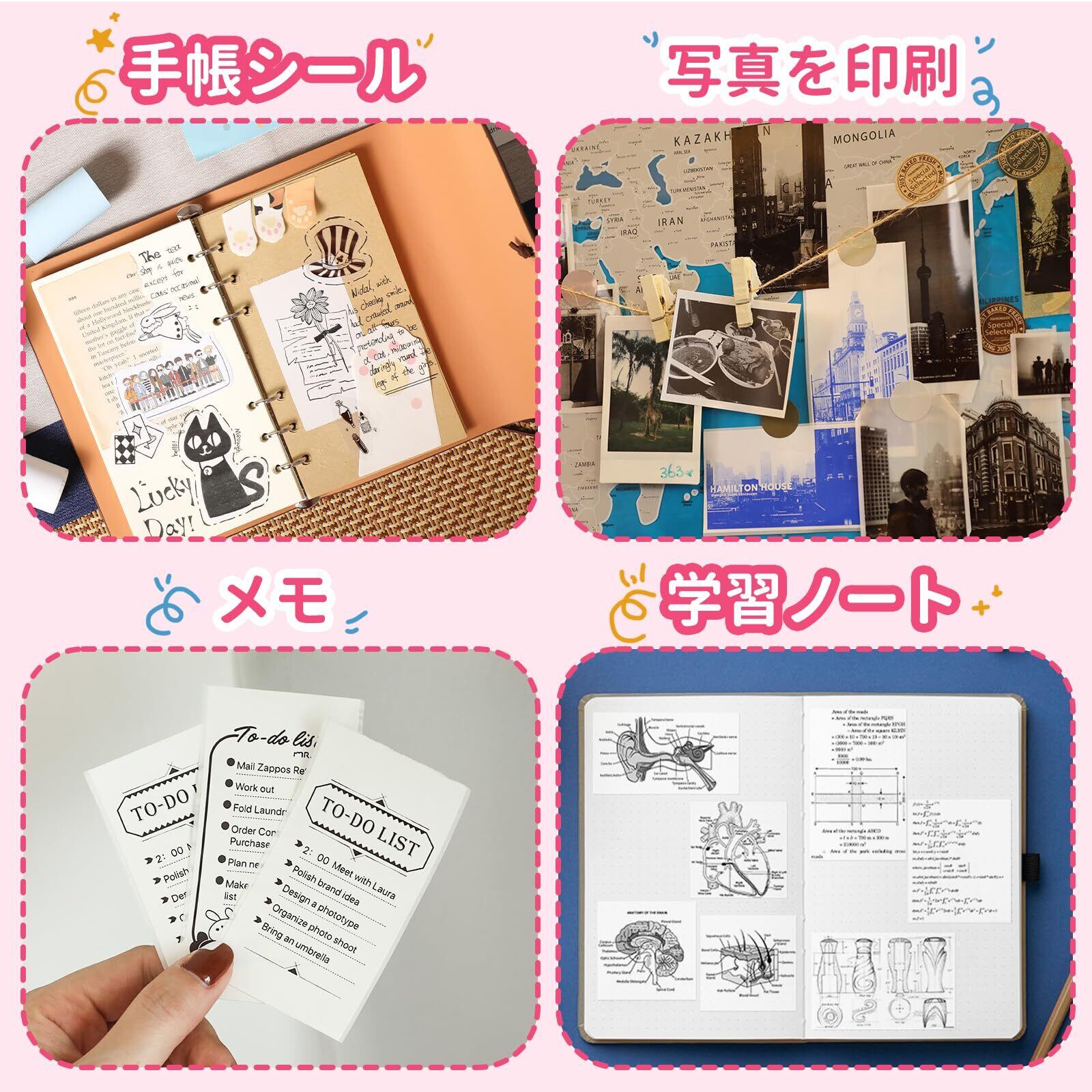 用途が広い-大サイズのサーマルプリンタは、サラリーマンがドキュメントを印刷するのに最適で、学生や先生がノートを印刷したり、練習したりするのにも適しています。それだけでなく、他のアイデアシールや手作りの書籍を印刷するのにも使用できます。これは多機能ポケットプリンタです。