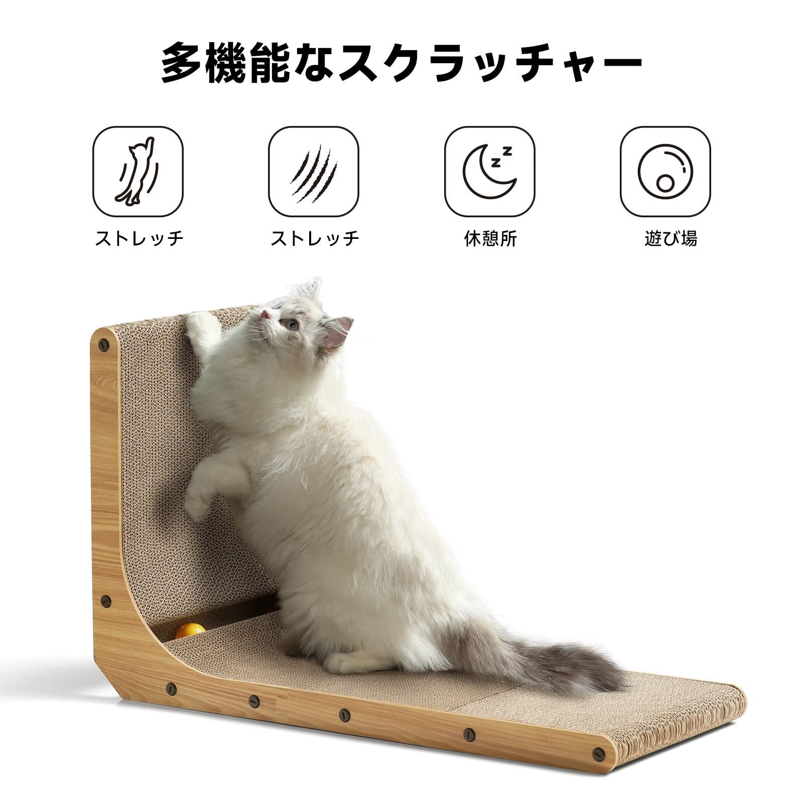 ユニークなデザインーこの爪研ぎはL字型をしています。これによって猫ちゃんが縦や横で爪とぎをすることが出来るだけでなく、猫ちゃんの休憩したり遊んだりする場所にもなります。