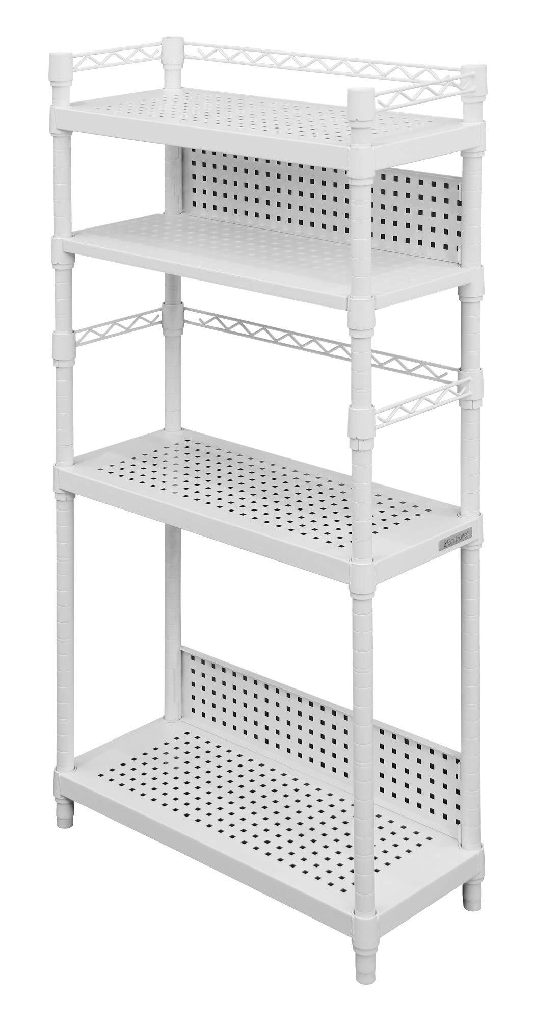 棚板にスチールプレートを採用し、メタルシェルフと比べ安定感を向上。
