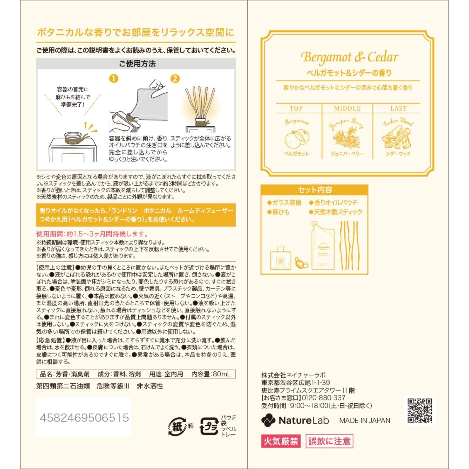 ランドリン ボタニカル ディフューザー ベルガモット&シダー 芳香剤 80ml