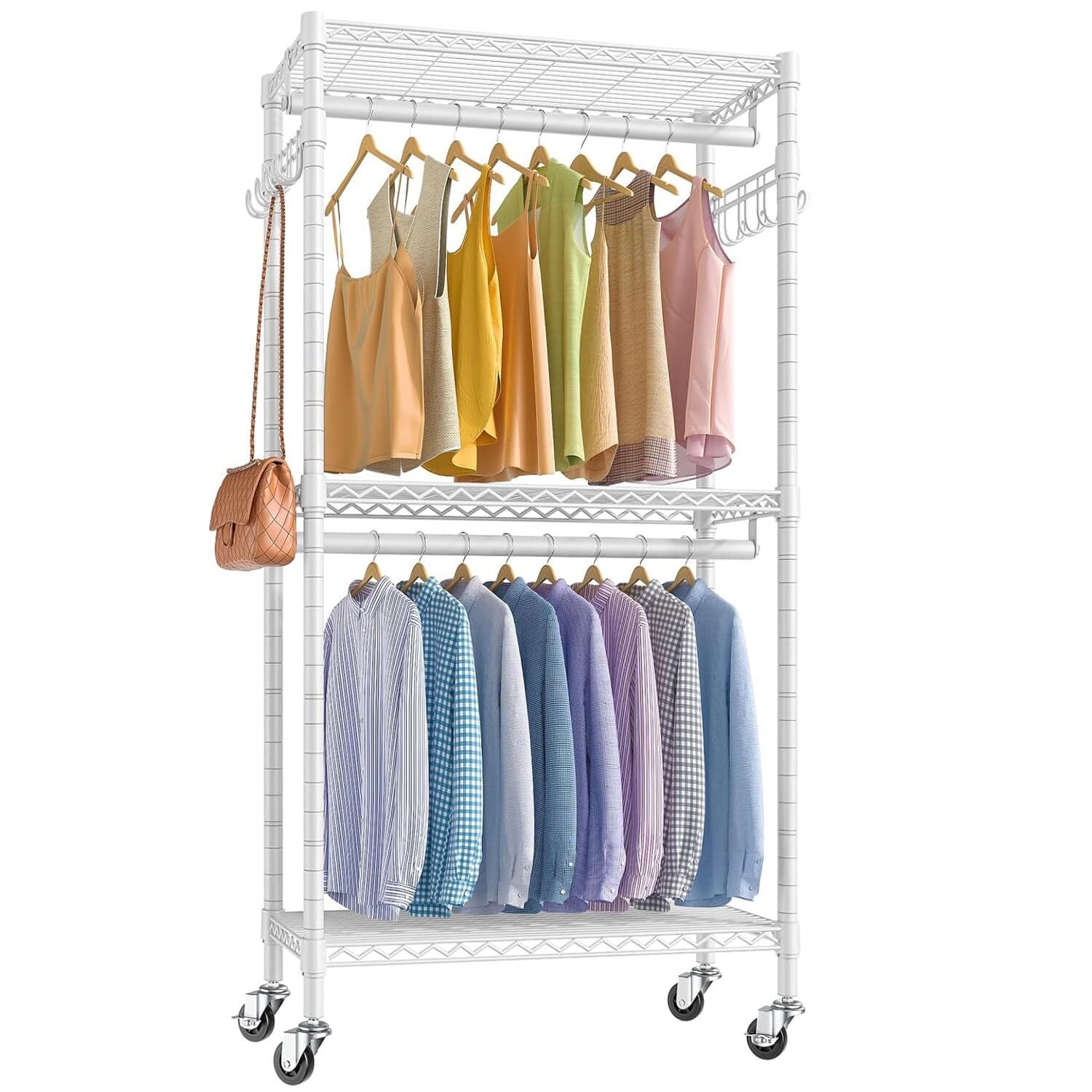ハンガーラック 頑丈 洋服ラック 大容量 キャスター付き 棚付き 耐荷重200kg クローゼット ワードローブ 2段 洋服掛け 防サビ加工 組み立て簡単 高さ調節 省スペース おしゃれ ハンガーかけ コートハンガー 洋服収納 (幅74×奥行40×高さ195cm ホワイト)