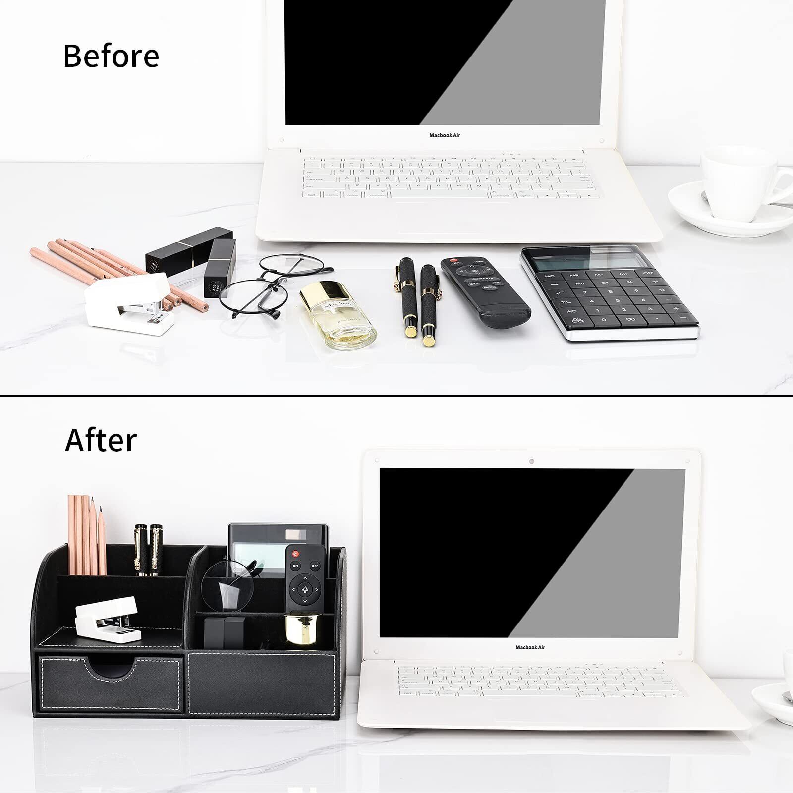 KINGFOM PUレザー デスク収納ボックス/収納ケース 卓上オーガナイザー ペン/鉛筆立て 文房具収納 文具スタンド リモコン/小物/雑物収納 引き出しつき おしゃれ (ハフレザー-ブラック)