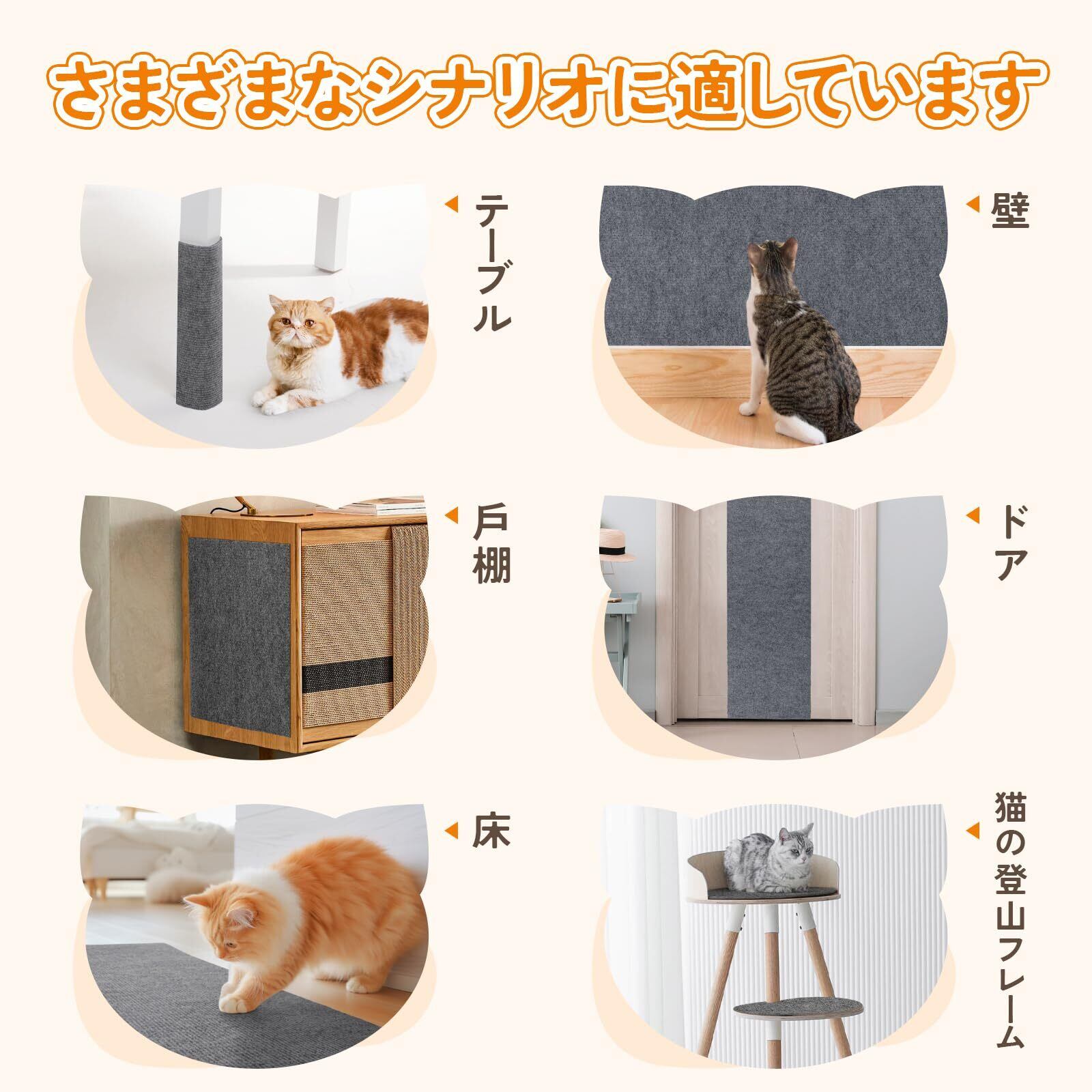 【多用途&適用場所】:猫 爪研ぎマットは、リビング、寝室、キッチンなど猫がよく出入りする場所だけでなく、玄関やバルコニーなどさまざまなシーンでも使用できます。タイルの壁、床、ドア、キャビネット、ソファなど、さまざまな家具に貼り付けることができます。猫のベッドやマットとしても兼用でき、猫がよくいる場所に配置することで使用頻度を増やすことができます。自宅だけでなく、賃貸住宅、会社の住居、新築の建物でも安全に使用できます。