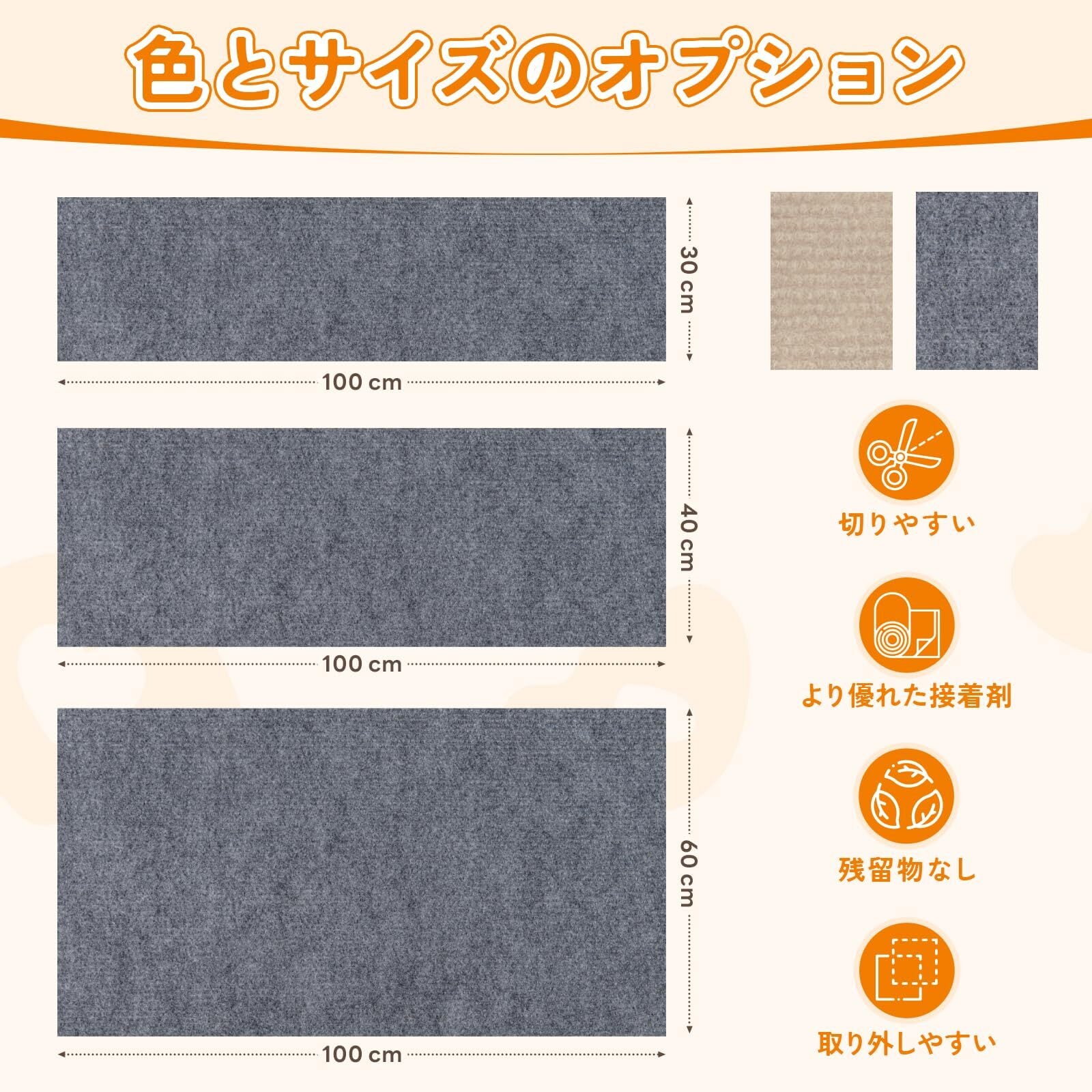 【簡単剥離&取付簡単】:猫つめとぎシートは、自己粘着式の裏面を持ち、取り付けが非常に簡単です。裏面の保護膜を剥がし、床や家具の表面に貼り付けるだけで、素早く取り付けができます。このシンプルな取り付けは飼い主にとって手間がかからず、猫にいつでも使える環境を提供します。また、爪研ぎシート 壁は取り外し可能で再利用できるため、角から剥がすことで簡単に全体を取り外せます。ヒント:取り付ける表面を清掃し、汚れや埃がないことを確認してください。壁に貼り付ける必要がある場合は、タイル壁や木の壁をお勧めします。灰泥壁に貼り付けないでください。取り外す際に壁が損傷する可能性があります。貼り付けた場所の角では、カットして個別に貼り付ける必要があります。剥がすときに水を少し加えると接着剤が取れるので、剥がして貼り直すのが早くなります。