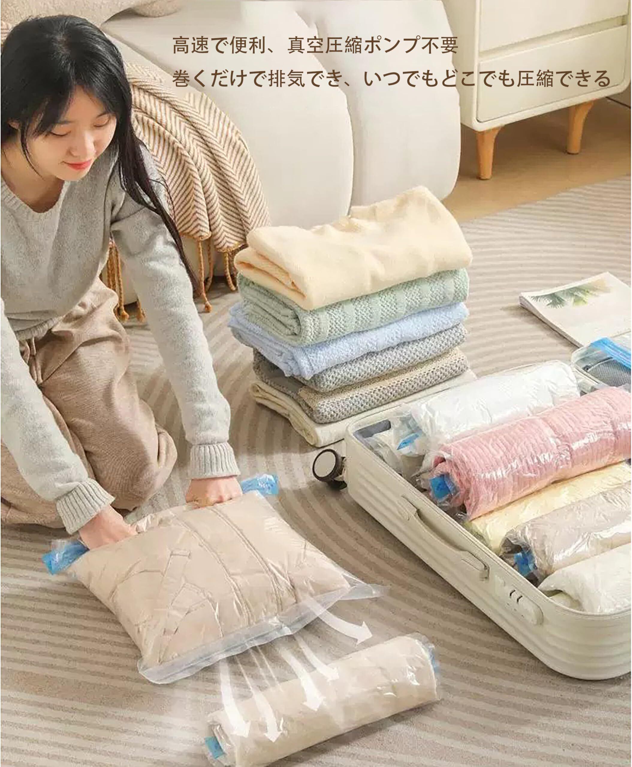 VEVE&MIKI 圧縮袋 衣類圧縮袋 下着 ふとん 出張 手巻 約80%圧縮 ポンプ不要 掃除機不要 でどこでも簡単圧縮 省スペース コンパクト 高密封性 防湿 防塵 防臭 防カビ 旅行バック 衣類 収納 旅行 家庭用 再利用可能
