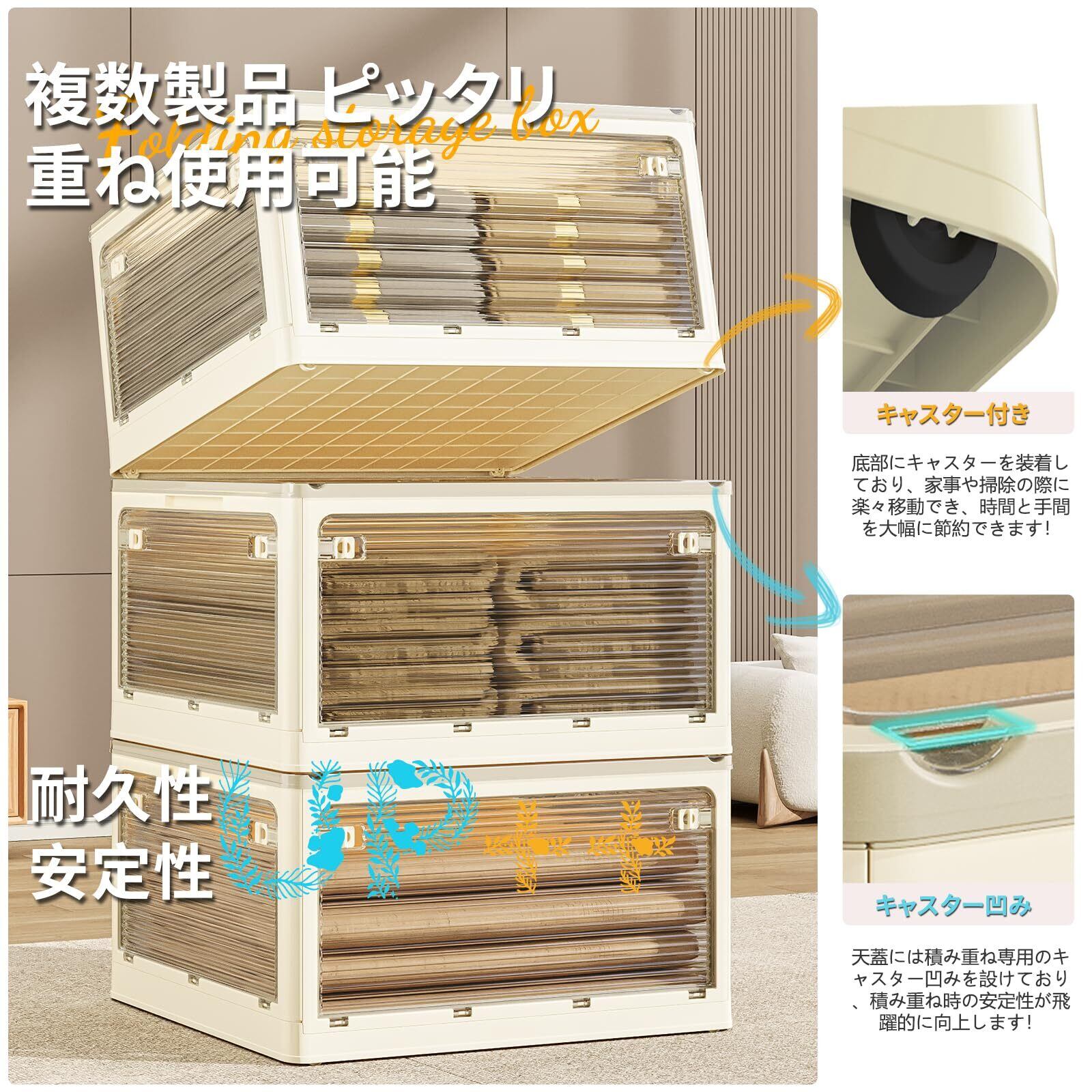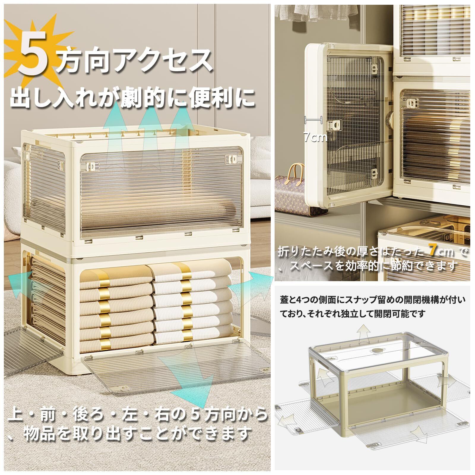 収納ボックス 折りたたみ 5面開き 衣装ケース 収納ケース 蓋付き 折り畳み コンテナ ボックス 衣類収納 押入れ 片付け 小物入れ 隙間収納 キャスター付き 組立簡単 積み重ね クリーム色 L:1個 W51.5×D36×H30cm