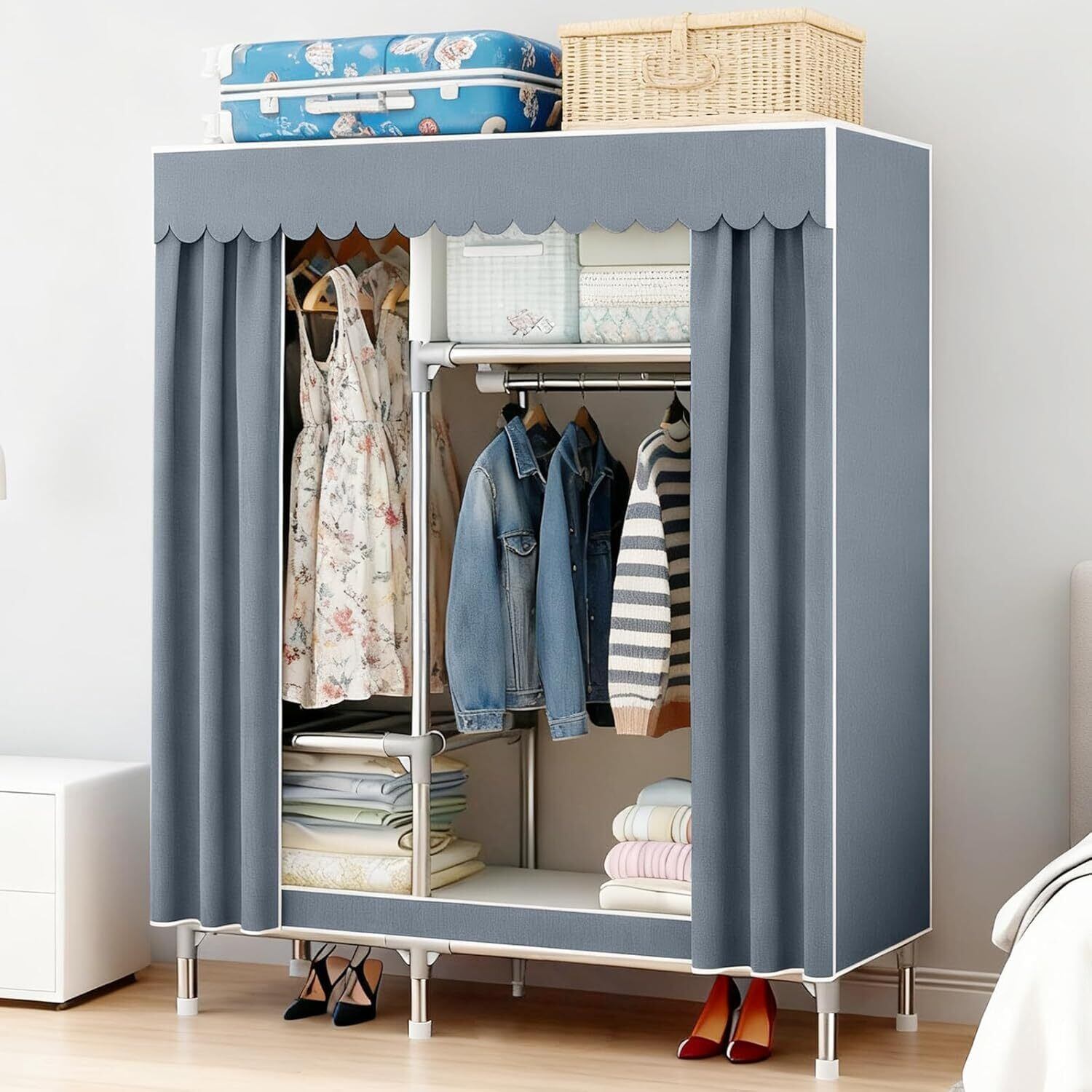 大容量収納で季節衣類をまとめて管理:こちらのワードローブはスチールフレームと広い収納スペースで、夏物30着から冬物90着までスムーズに収納可能。上部スペースにはスーツケースやキルト、下部には靴・ブーツなども配置でき、季節ごとの衣替えも楽々。高さ170cm×幅108cmの立体設計で、長いコートから短いトップスまでバランスよく吊るせます。