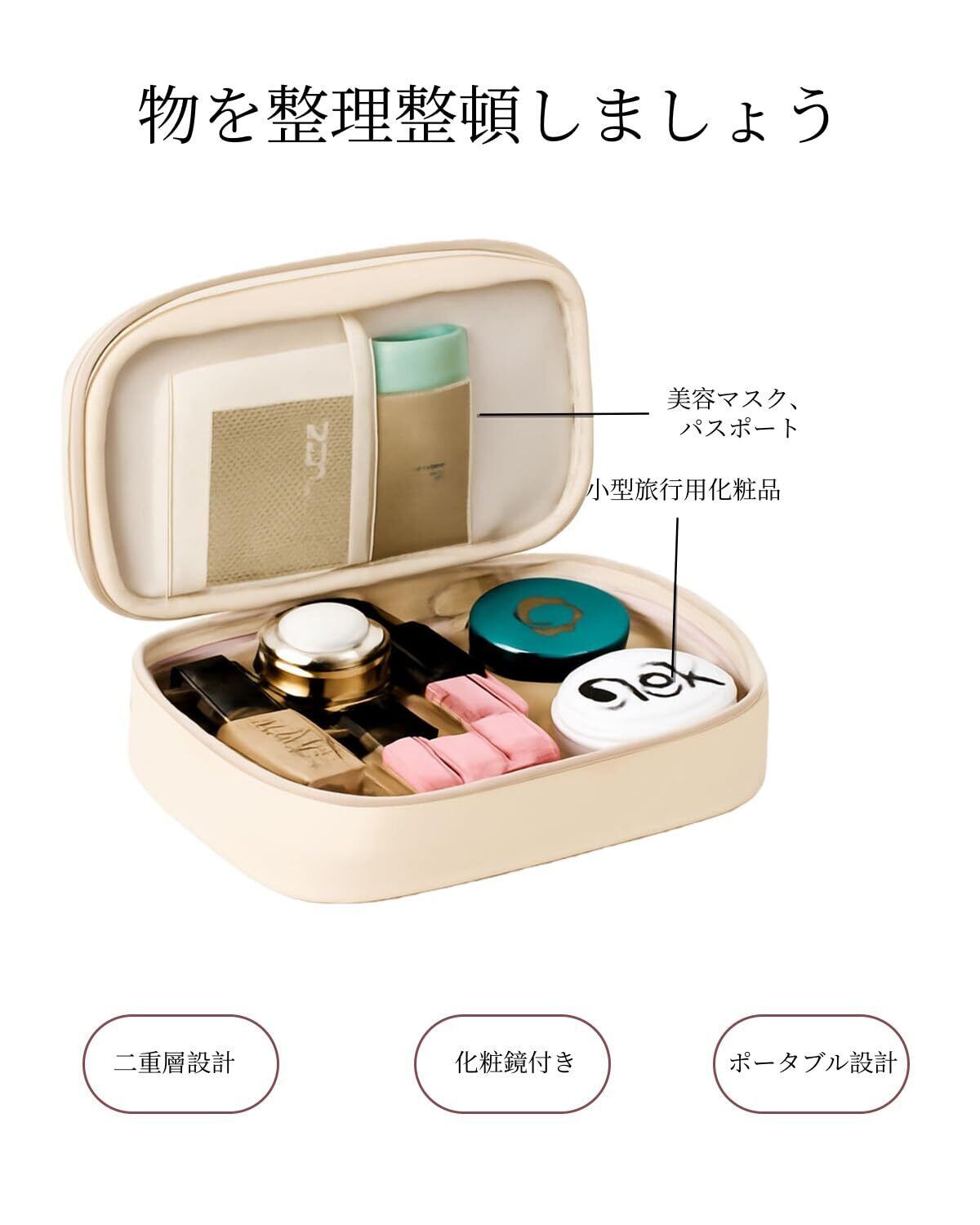 【二層式デザイン】1層目には高解像度のメイクアップミラーがあり、その下にはメイクブラシを収納できるスペースがあります。2層目にはメッシュポケットがあり、その下には化粧品を収納できるスペースがあります。口紅、ファンデーション、アイシャドウ、マスカラなど、メイクアイテムを分けて整理するのに便利です。