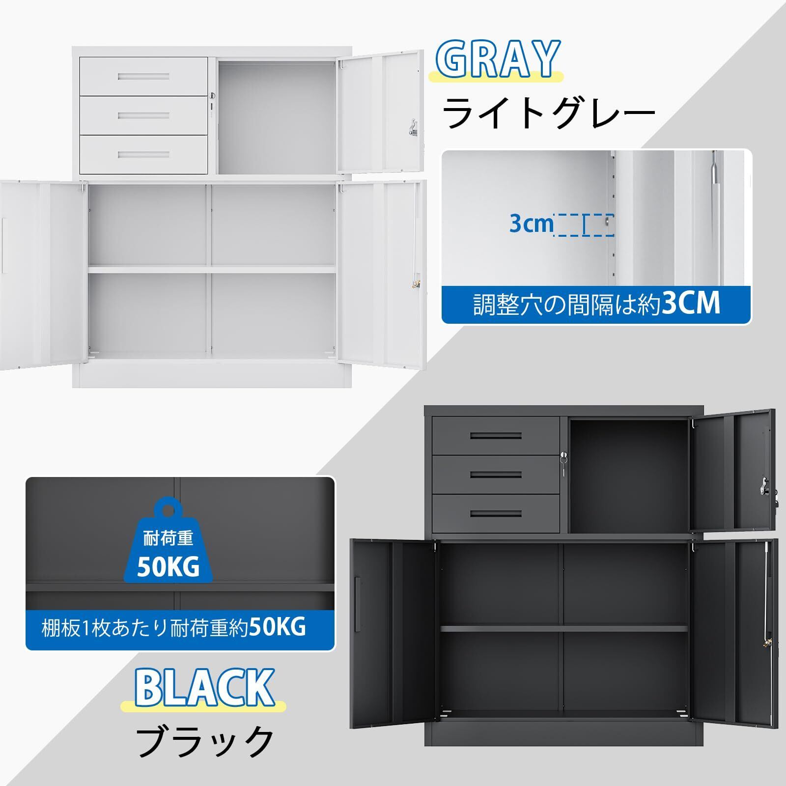 DEWEL スチールロッカー 鍵付き書庫 鍵付きキャビネット スチール製 書庫 保管庫 収納庫 おしゃれ 業務用 法人、個人事業主様向け 3段 A4対応 可動棚 (ライトグレー, 高さ109cm)