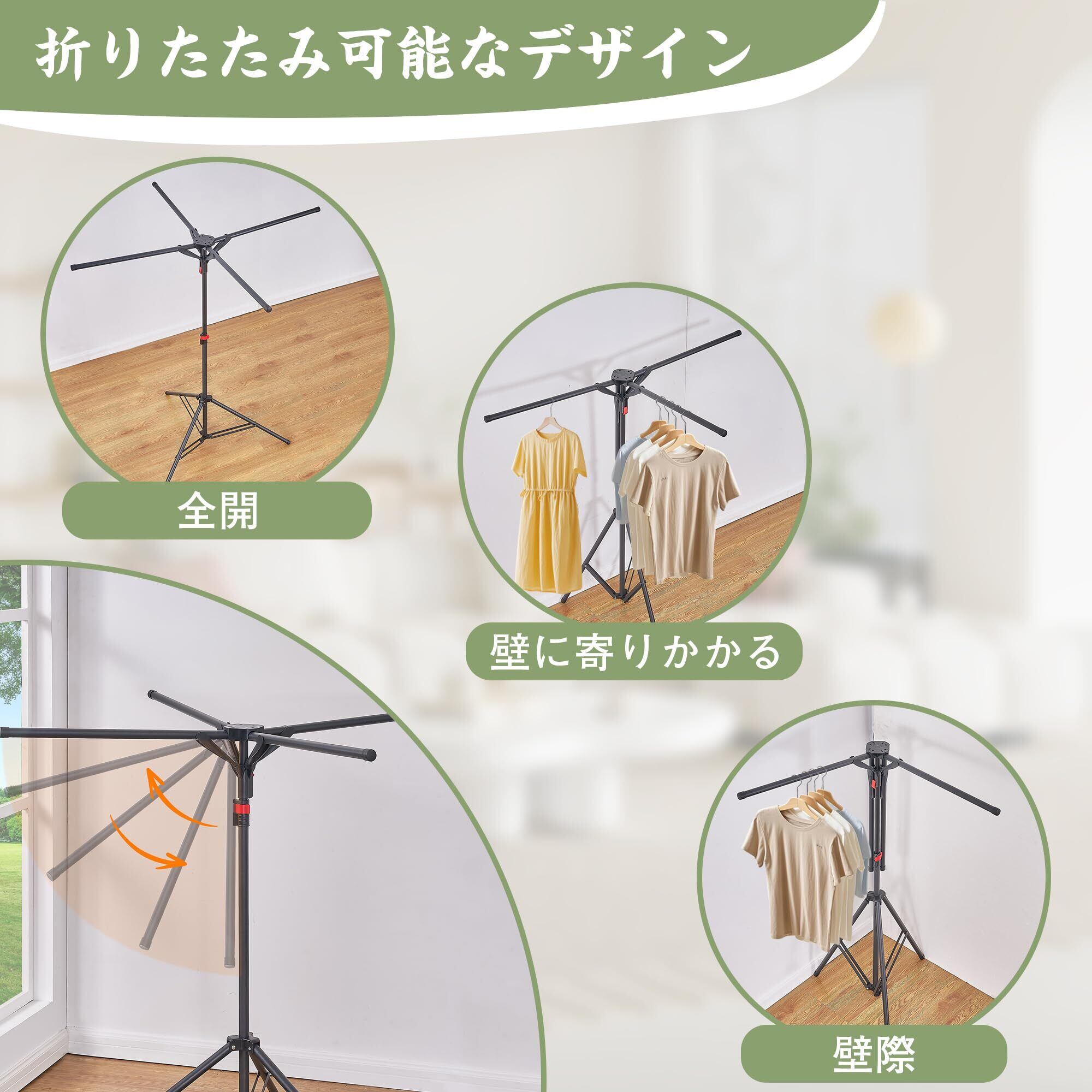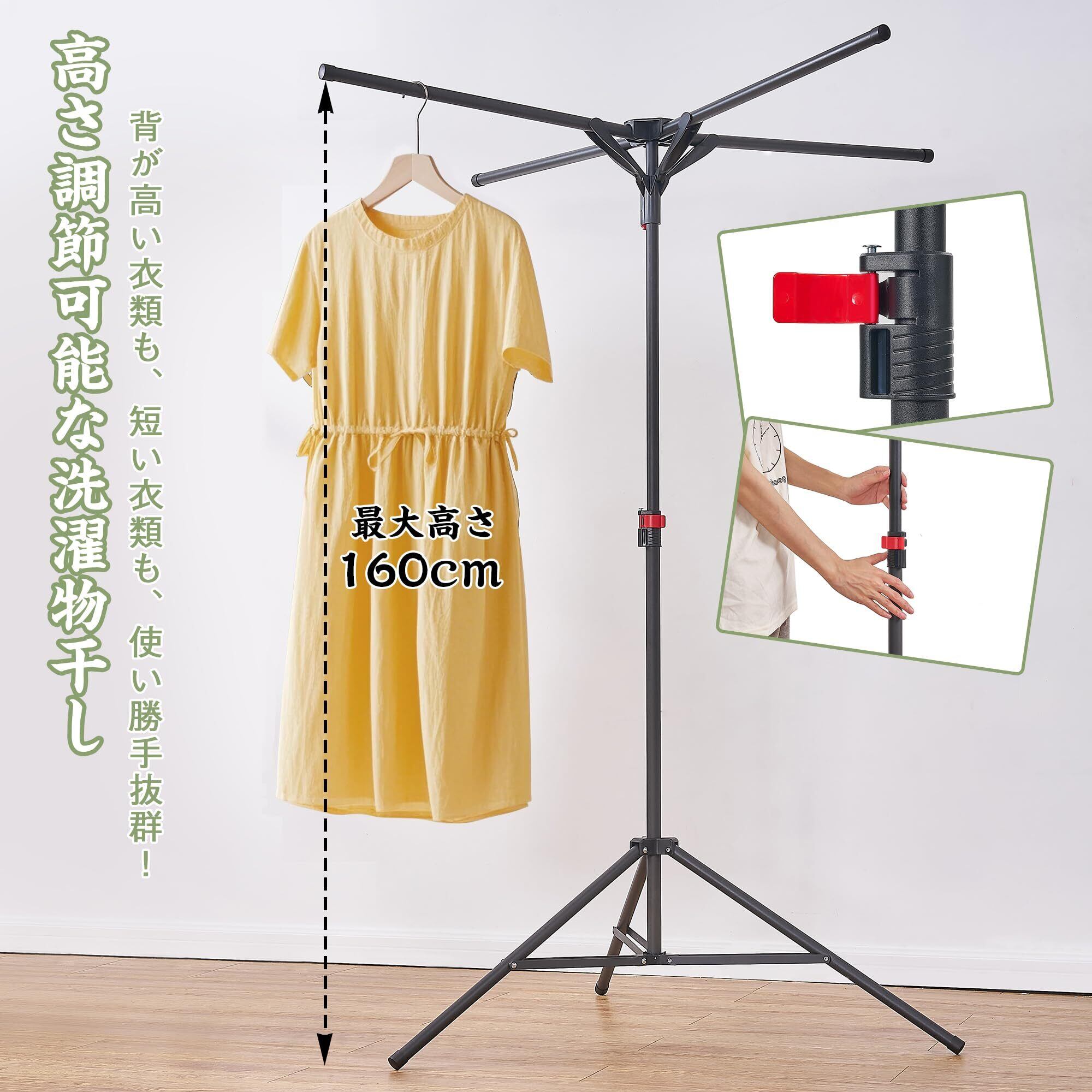 【折りたたみ可能なデザイン】上部は、使用状況や必要に応じて折りたたむことが可能です。これにより、物干しスタンドは干す物の量やスペースに合わせて柔軟に調整でき、使い勝手がさらに向上します。高さも調整できるので、さまざまな洗濯物の種類やシーンに対応できます。この柔軟な調節機能が、家庭での幅広いニーズに応えます。