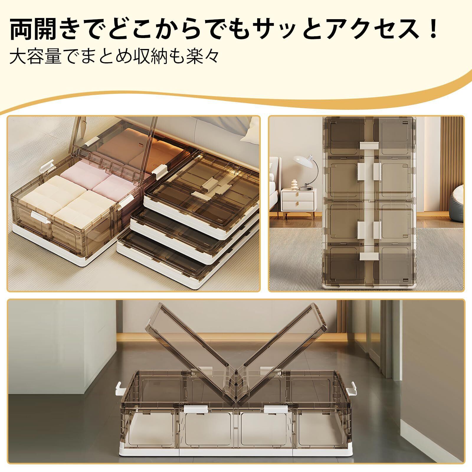 【超薄型三段折りたたみ設計】 ベッド下収納ボックス 折りたたみ式は未使用時に厚さわずか8cmまで薄型化。通常サイズの三分の一となる薄さで、ベッドした収納ケースとして押し入れにすっきり収納可能。季節衣替えや引っ越し時の省スペース収納を実現します。