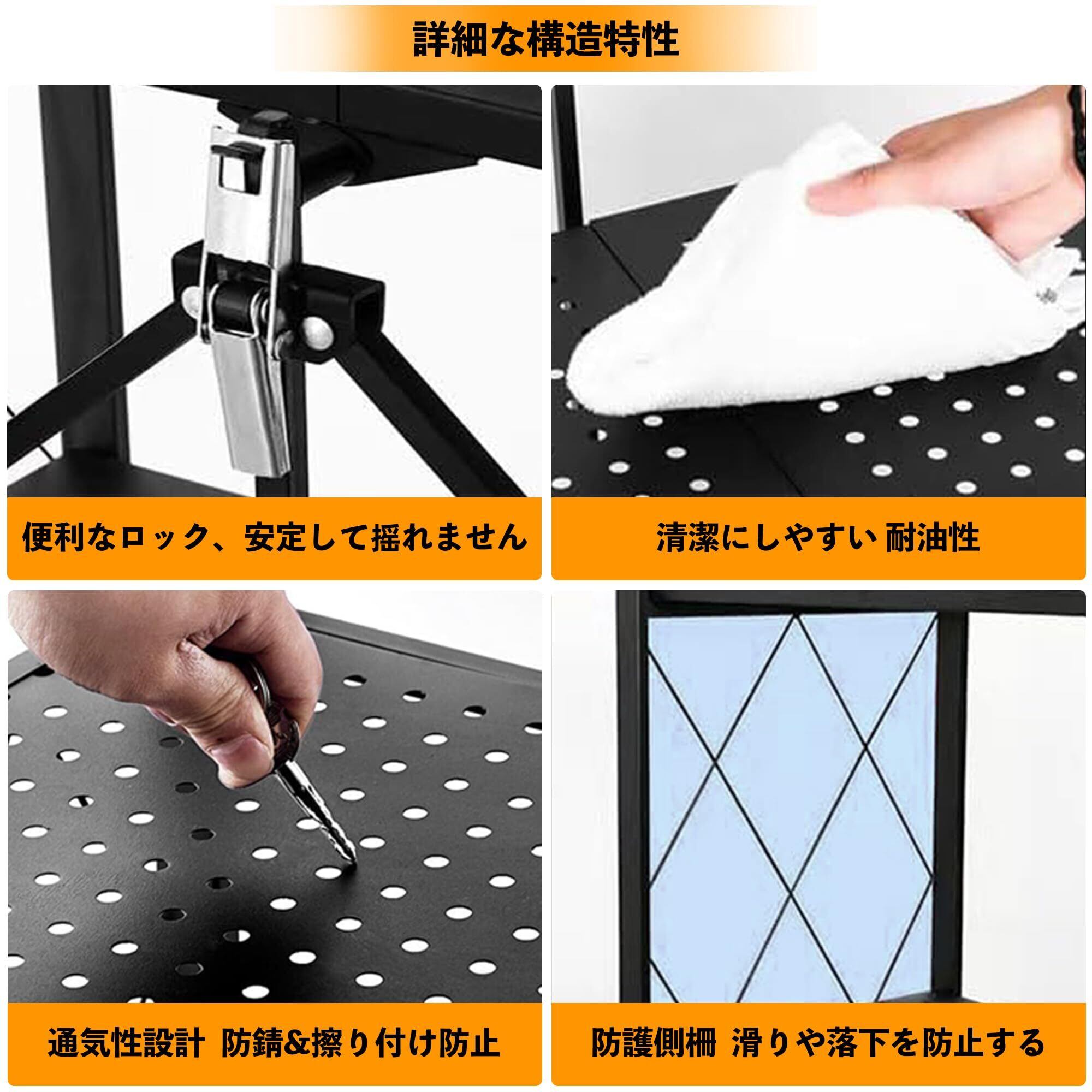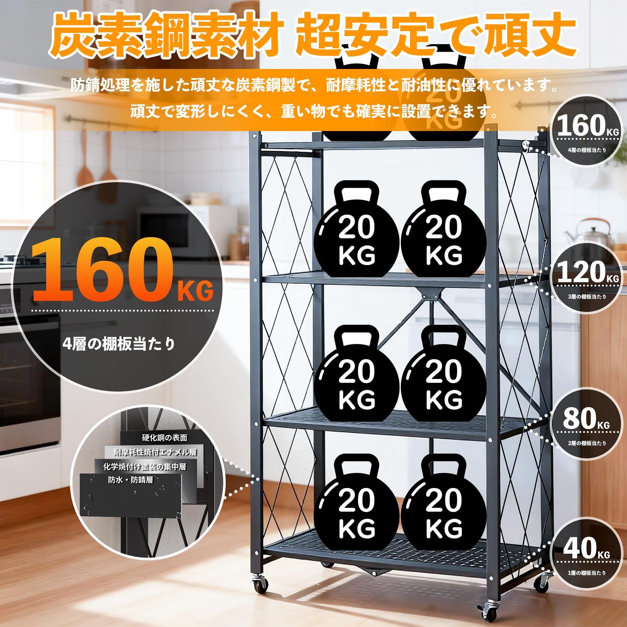 【強靭なメタルシェルフで耐久性抜群】この棚は高品質の炭素鋼で作られています。 厚みがあり、強力な支持力があります.。各段40kgまで均等に荷重でき、本やキッチン家電、工具なども安心して収納可能。防錆・防水加工で、水周りやガレージでも長くご使用いただけます。