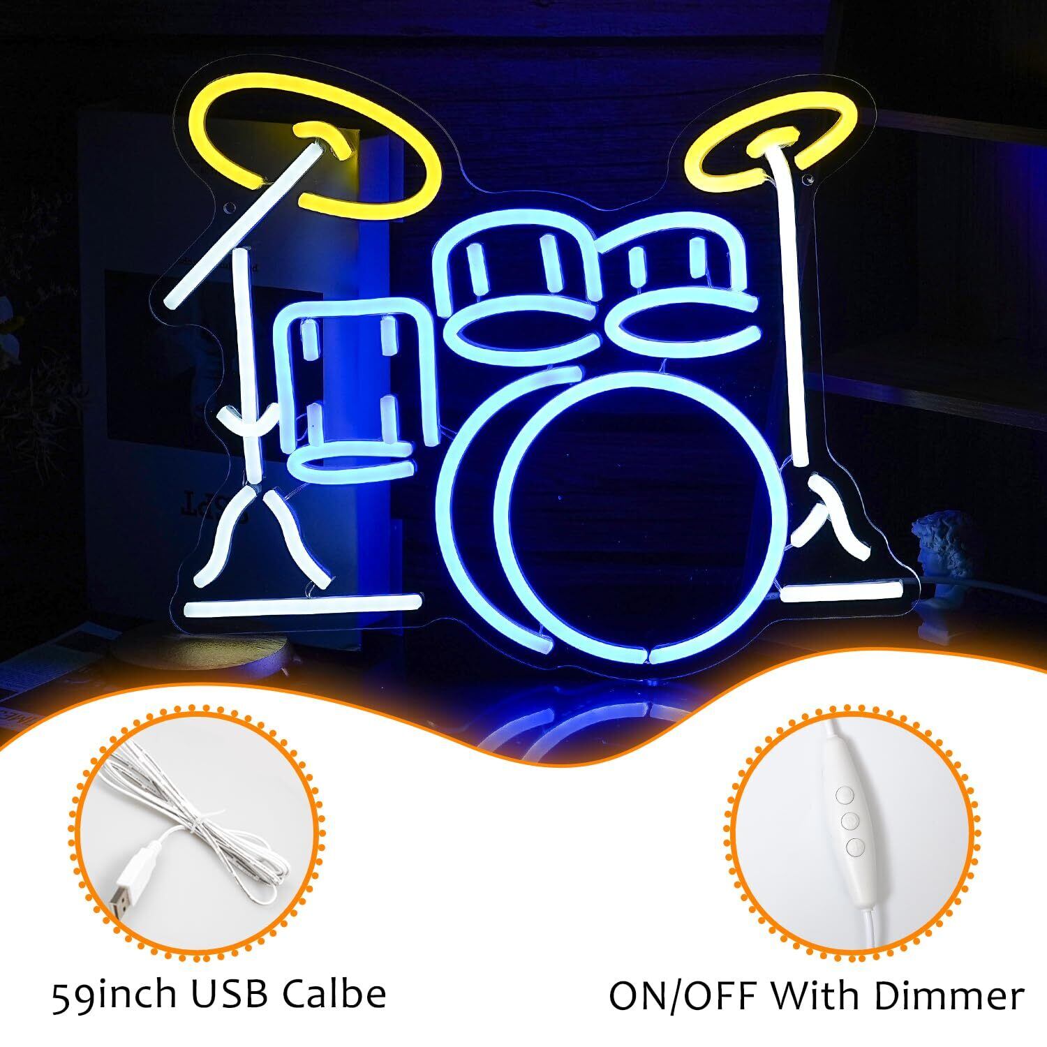 ドラムキットのネオンサイン:調光可能なドラムキットネオンライト。スイッチの3つのボタン、中央のコントロールスイッチ、上下のボタンで明るさを調整できます。(10% - 100%)USBケーブルの長さ:59インチ。部屋のどこにでも十分な長さを配置できます。青いドラムキットのネオンライトは、元のネオンライトよりも明るくて暖かいです。