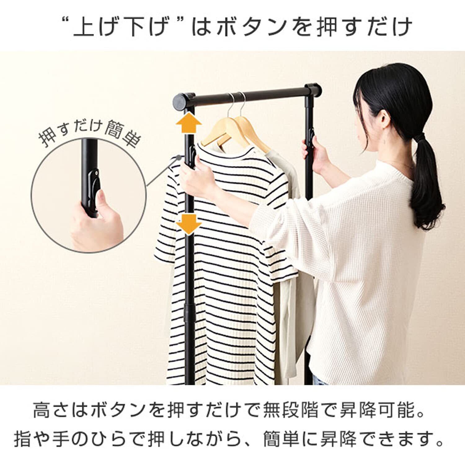 ワンタッチボタン式昇降だから衣類を掛けたまま高さ調整可能。下棚にはカバンやボックスが置けます。