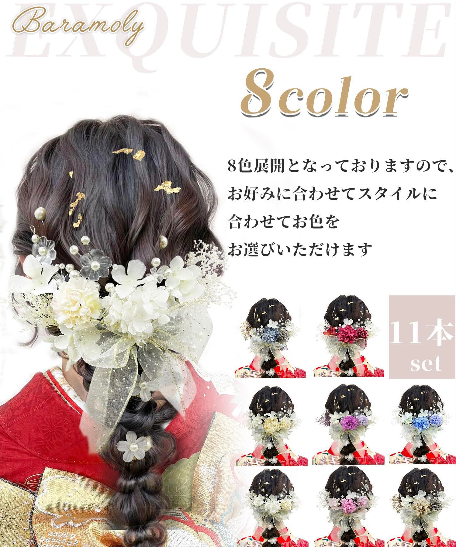 【華やかな髪飾り】リボン、アジサイ、かすみ草、パール、ホワイト小さい花、水引、金箔などを華やかにする髪飾り11点セット