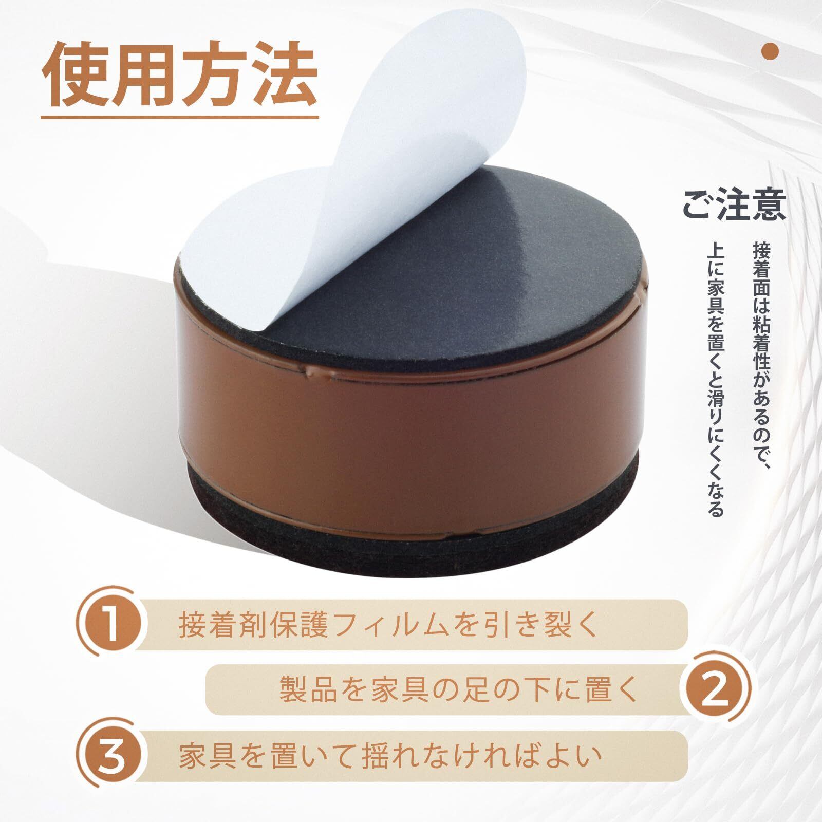 【商品仕様】円形:直径6cm 高さ32mm カラー:ブラウン 材質:両面テープ+炭素鋼+フェルト 適応サイズ: 6×6cm以下の角脚、直径6cm以下の丸脚