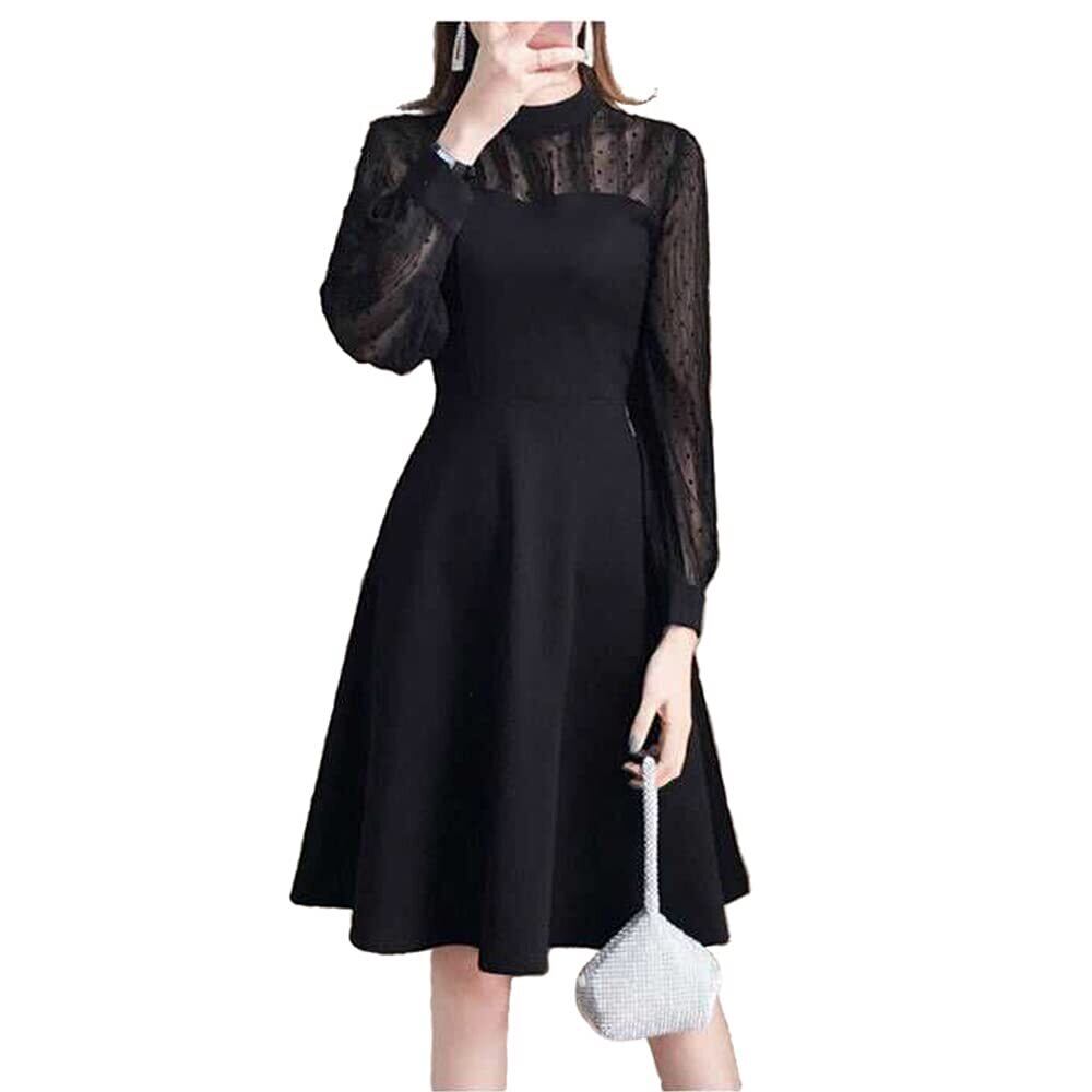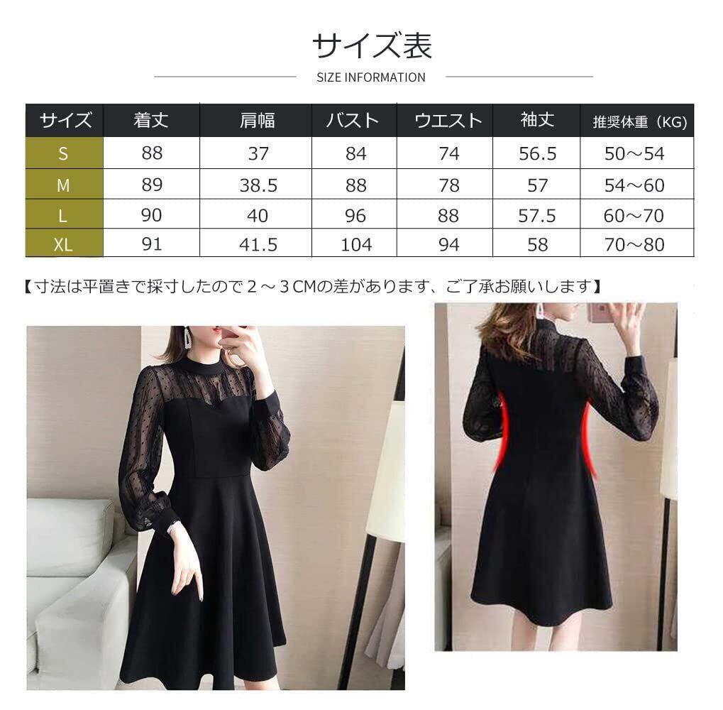 [Collecala] ワンピース レディースロング長袖ドレス ドットフロッキープリント クルーネック 肩透けセクシーワンピース 膝丈 Aライン 結婚式パーティードレス 通勤 二次会 結婚式