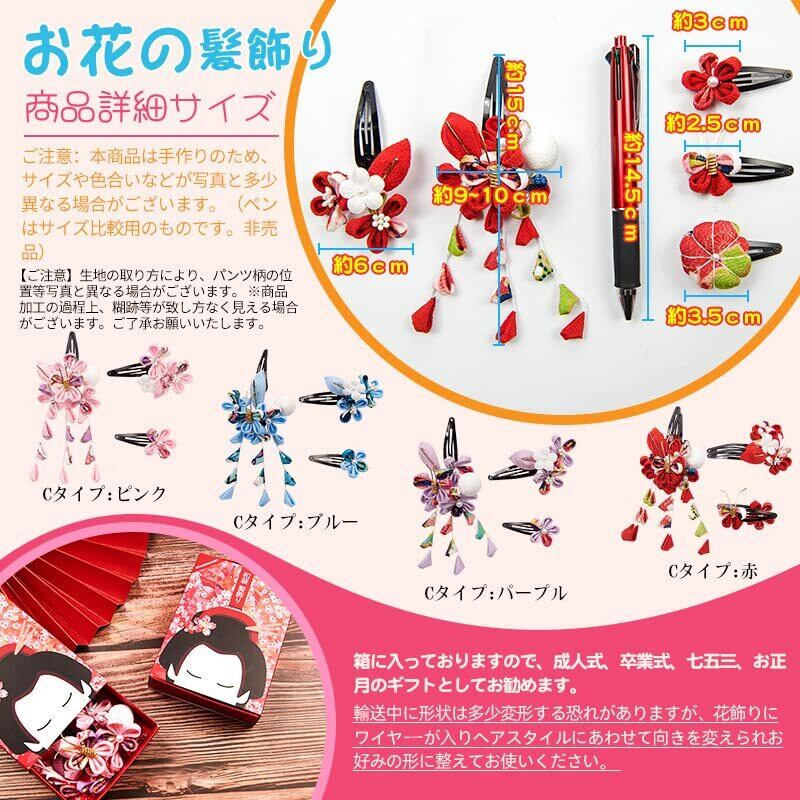 OTAKUMARKET 七五三 髪飾り 成人式 振袖 浴衣 和装 つまみ細工 髪 飾り 着物 髪飾り 袴 卒業式 結婚式 セット 三歳 七歳 女の子 ガールズ 5タイプ 4カラー (Cタイプ (赤))