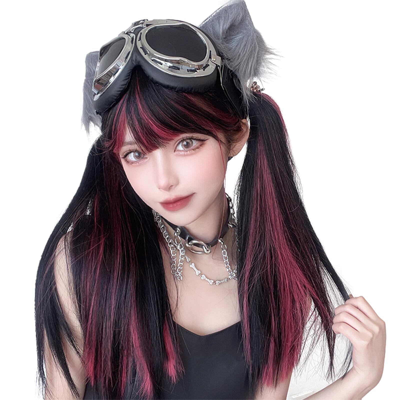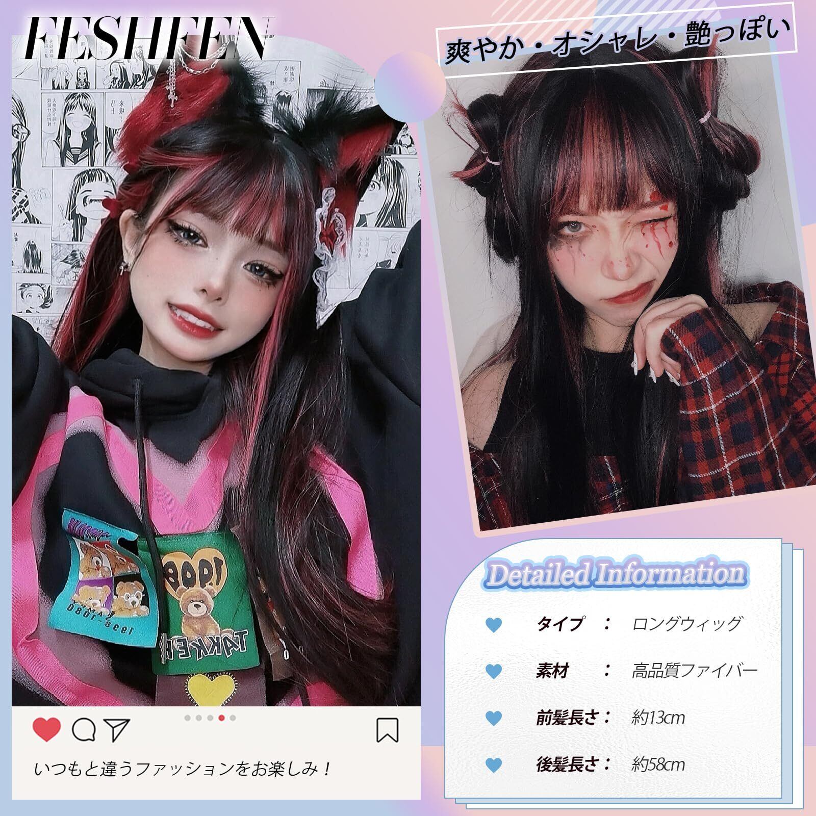 FESHFEN ウィッグ ロング ストレート インナーカラー かつら 自然 ウィッグ 黒髪 女装 フルウィッグ カツラ ロングウィッグ レディーズ カツラ wig ウイッグ 小顔 ロングヘア ぱっつん前髪 韓国風 耐熱 小顔 人気 黒 ネット/櫛付き ブラック&ザクロレッド
