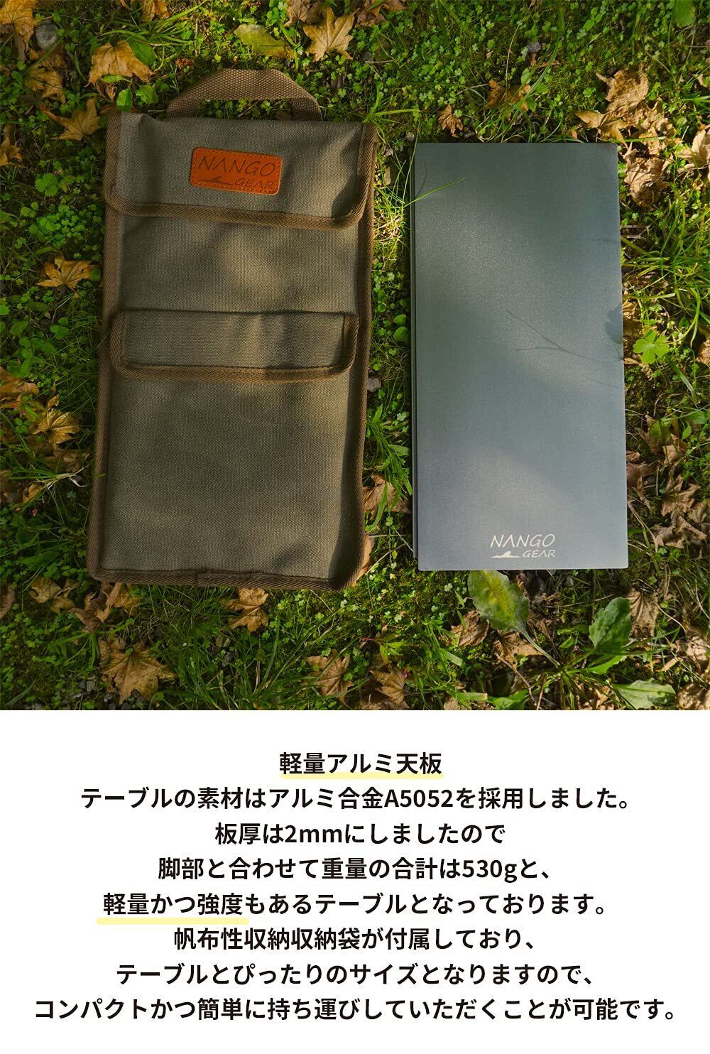 【南湖ギア アルミテーブル】こちらのテーブルはテーブル面に溝も切れ目も一切ない通常のアルミテーブルとなります。テーブル面のサイズは長さ34cm×幅17cmとなります。キャンプのみではなく、登山やツーリングの際にもお使いいただけるようにコンパクト設計にしております。
