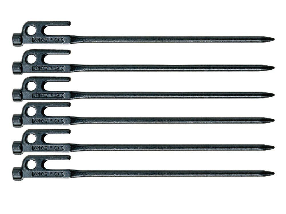 アウトドア用品メーカー、スノーピークのペグ6本セット。黒電着塗装のS55Cスチール製で、長さは300mm。打ち込み部の直径は8mmでヘッド部は直径15mm。ヘッド部にはロープを通すことができる穴が開いている。