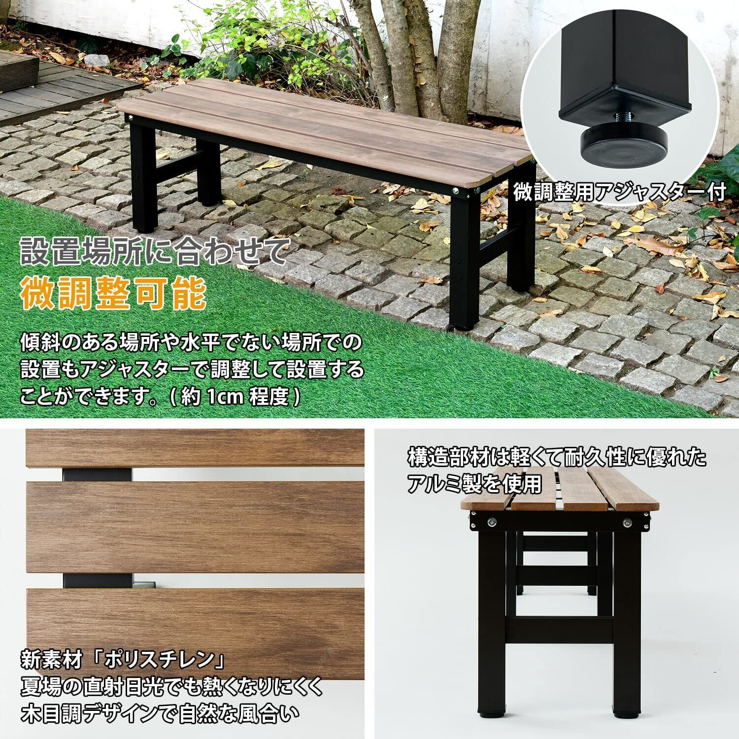 【特徴】木目調デザインで自然な風合いを組み合わせたアルミ縁台です。構造部材は丈夫で軽量なアルミ製で、設置場所の移動も簡単です。設置場所に合わせてアジャスターで微調整可能(約1cm程度)で、傾斜のある場所や水平でない場所での設置も調整して設置することが出来ます。