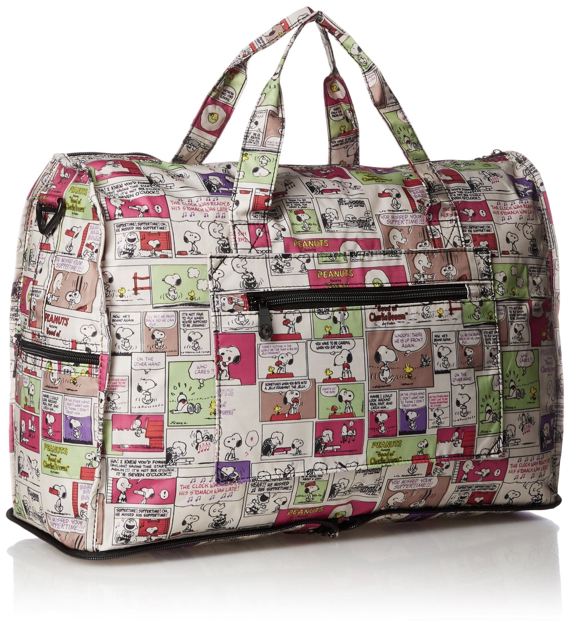 コンパクトに折りたためるスヌーピーのボストンバッグ。性別や年齢を問わないシンプルなデザイン。使わない時は小さく畳んで持ち運べるので、荷物が増える旅行の際などにとっても便利。スーツケースのキャリーバーを通せる機能付き。
