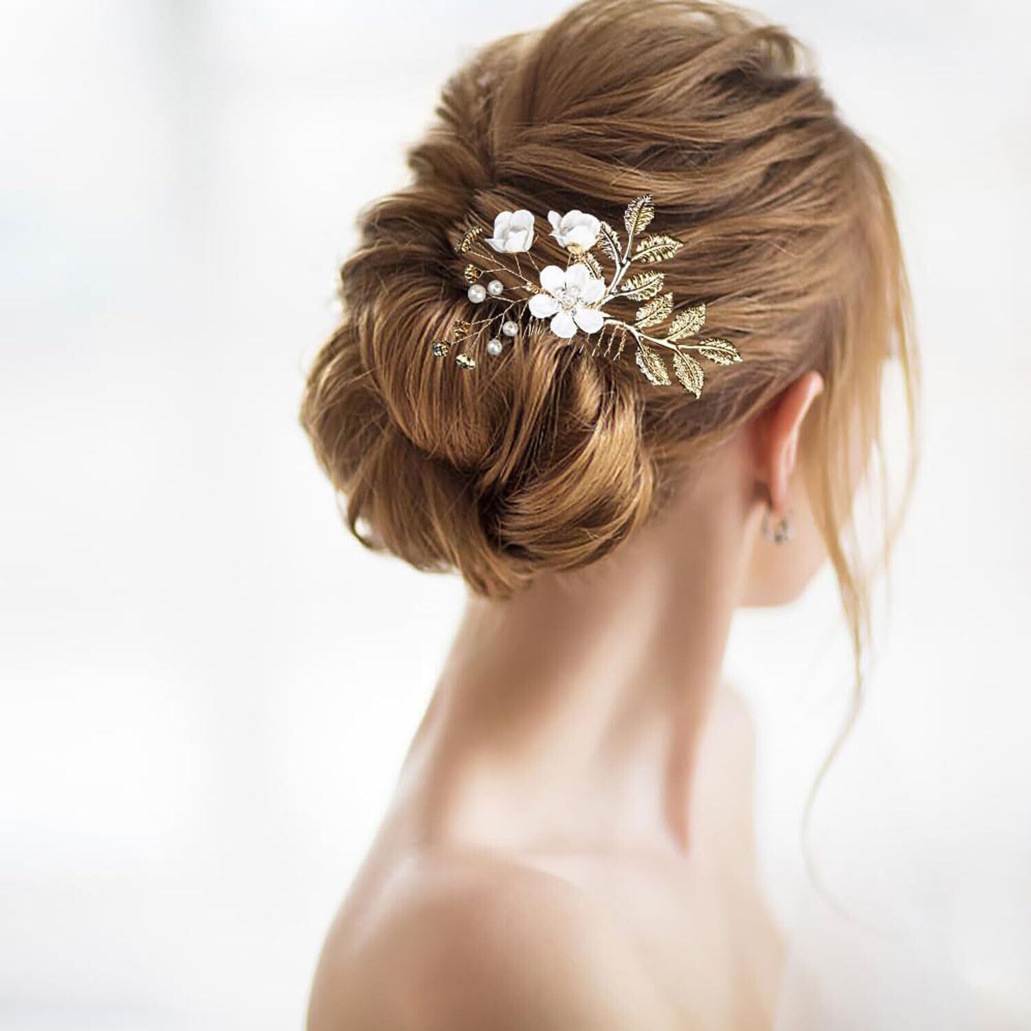 ゴールドをベースにフラワー・パール・ストーンデザインのヘッドドレス(コーム&Uピン 4種セット)
