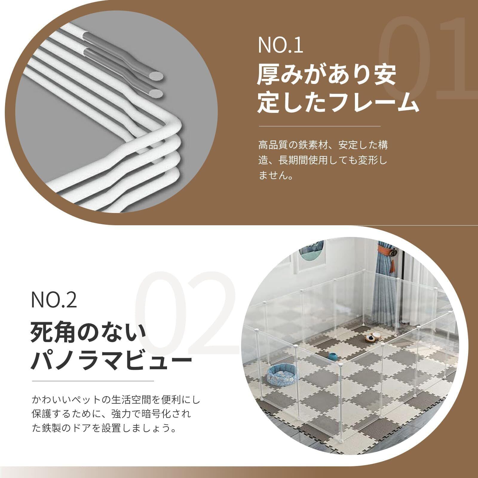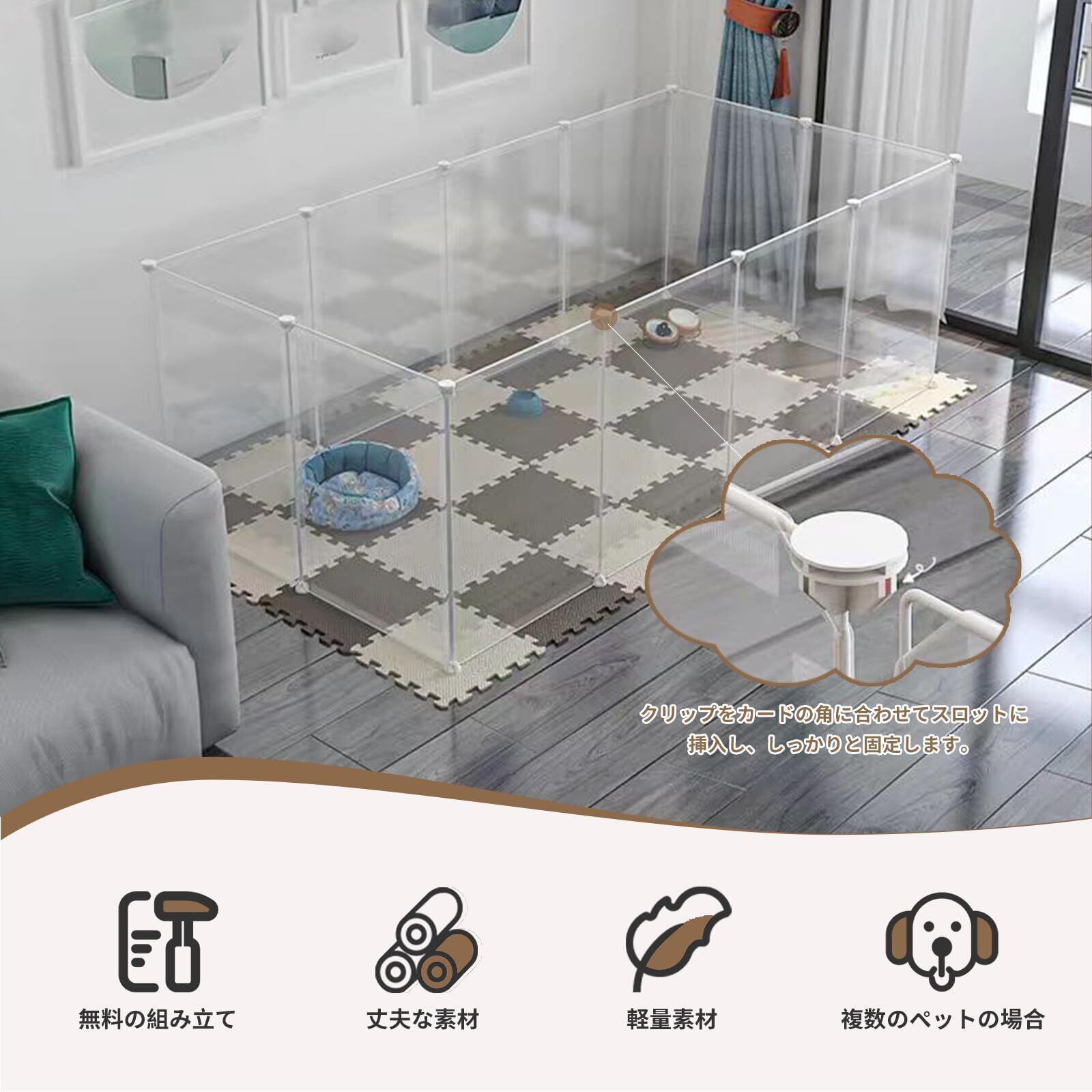 【自由レイアウトと優れた拡張性】12 枚の樹脂パネル(幅 350mm/450mm)で構成され、幼犬や小型犬はもちろん、ハムスター、うさぎなどの小動物にも対応します。犬の成長に合わせて、別売りパーツを追加してスペースを拡張でき、長期的に使用できる利点があります。