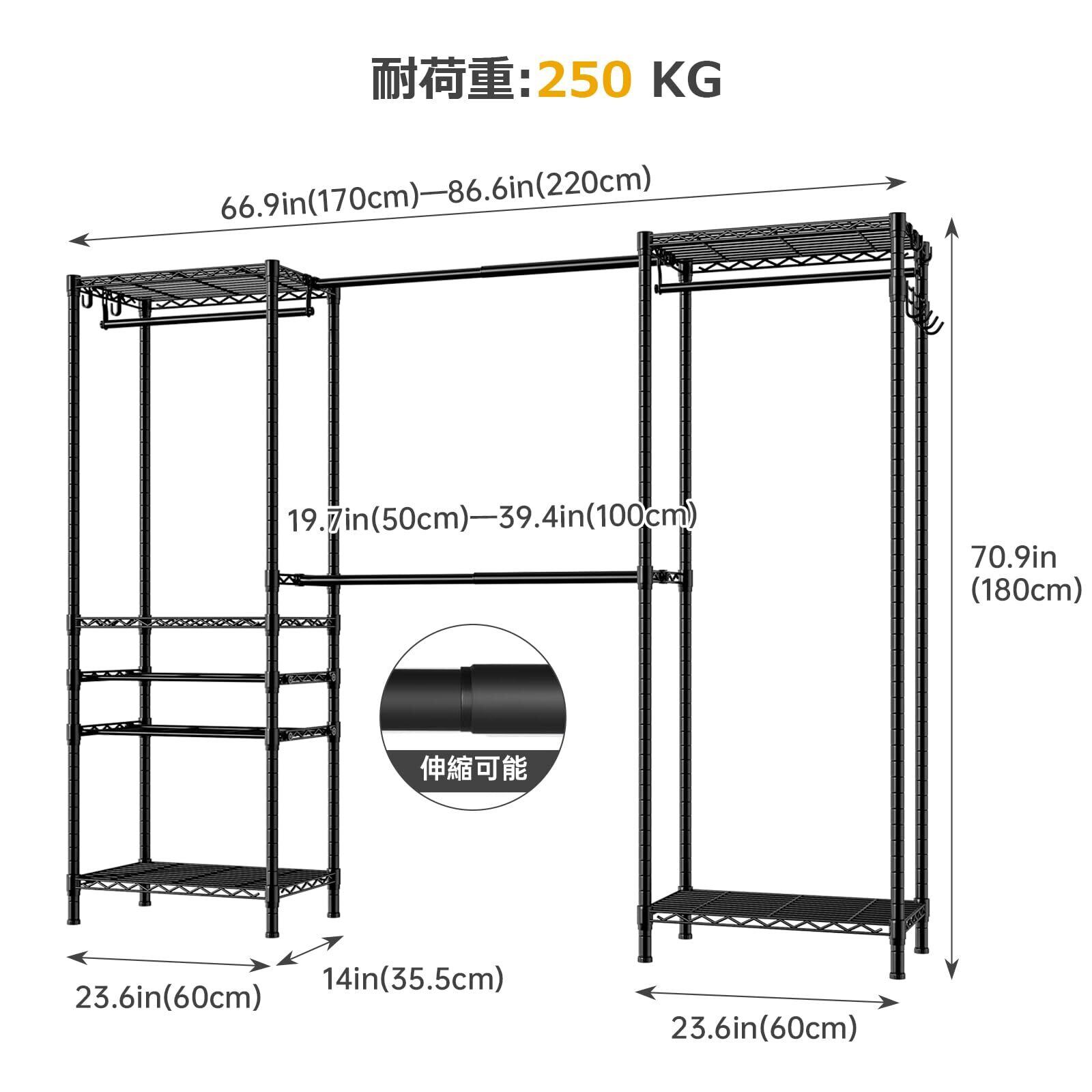 伸縮可能:横幅は約170~220cmまで自由に調節可能。設置スペースに合わせてレイアウト変更でき、ウォークインクローゼットや寝室収納にも最適な伸縮ハンガーラック。