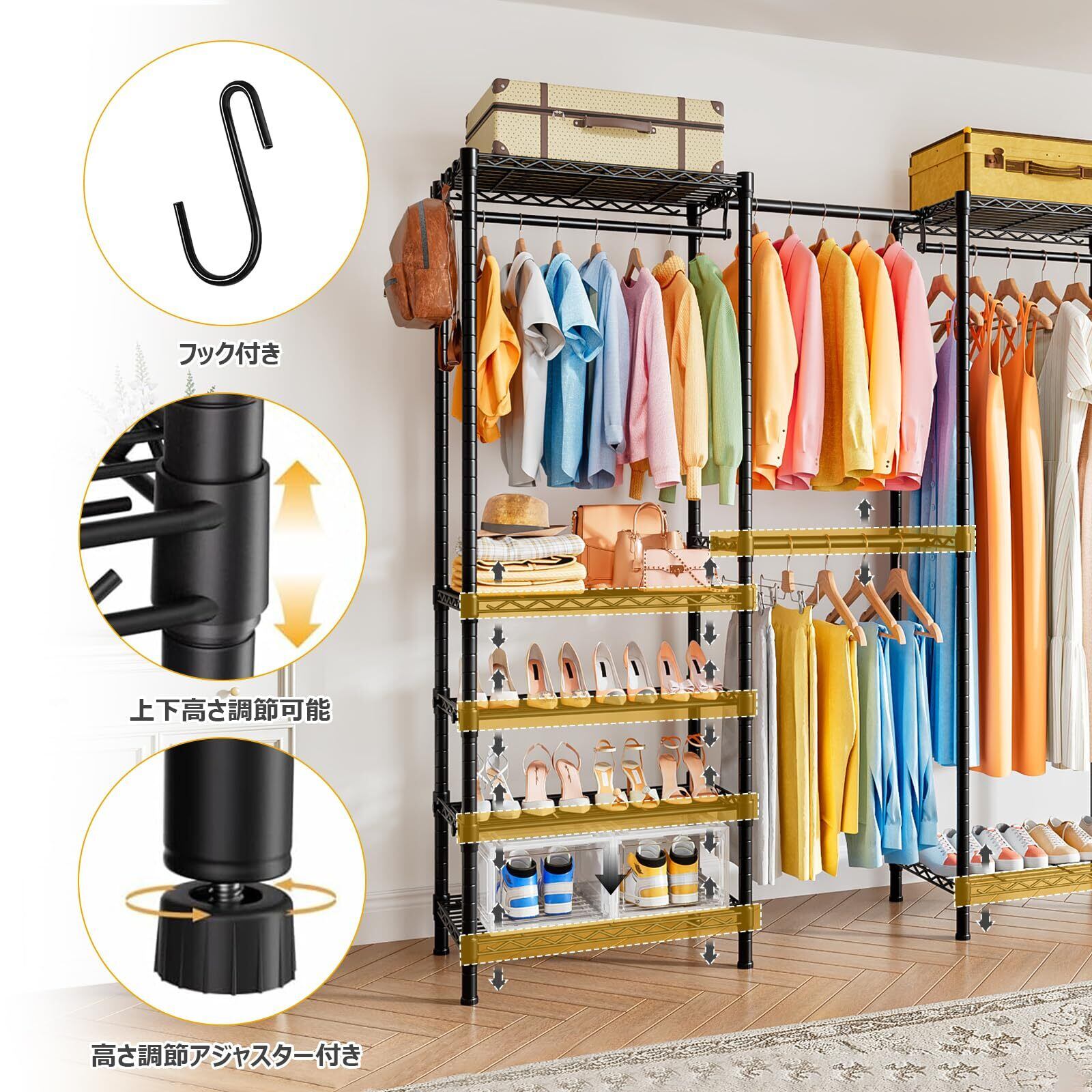 頑丈な構造:高強度スチール製フレームを採用したハンガーラック。大量の衣類や収納ボックス、靴を掛けてもたわみにくく、クローゼット収納・ワードローブとして長期使用でも安定感抜群。