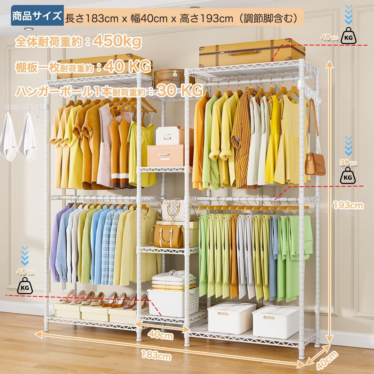 ハンガーラック 頑丈 大容量 洋服ラック 耐荷重450kg ワードローブ クローゼット 洋服掛け ハンガーラック 2段 省スペース おしゃれ 高さ調節可能 防サビ加工 衣類収納 組み立て簡単 家庭用 ワードローブ 幅183×奥行40×高さ193cm (ホワイト)