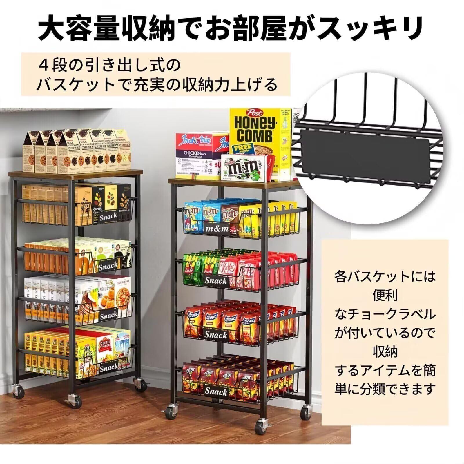 【大容量収納でお部屋がスッキリ】4段の引き出し式のバスケットで充実の収納力上げる。スパイスや小物、食材、書籍など、どんなアイテムでもきちんと整理可能。各バスケットには便利なチョークラベルが付いているので、収納するアイテムを簡単に分類できます。