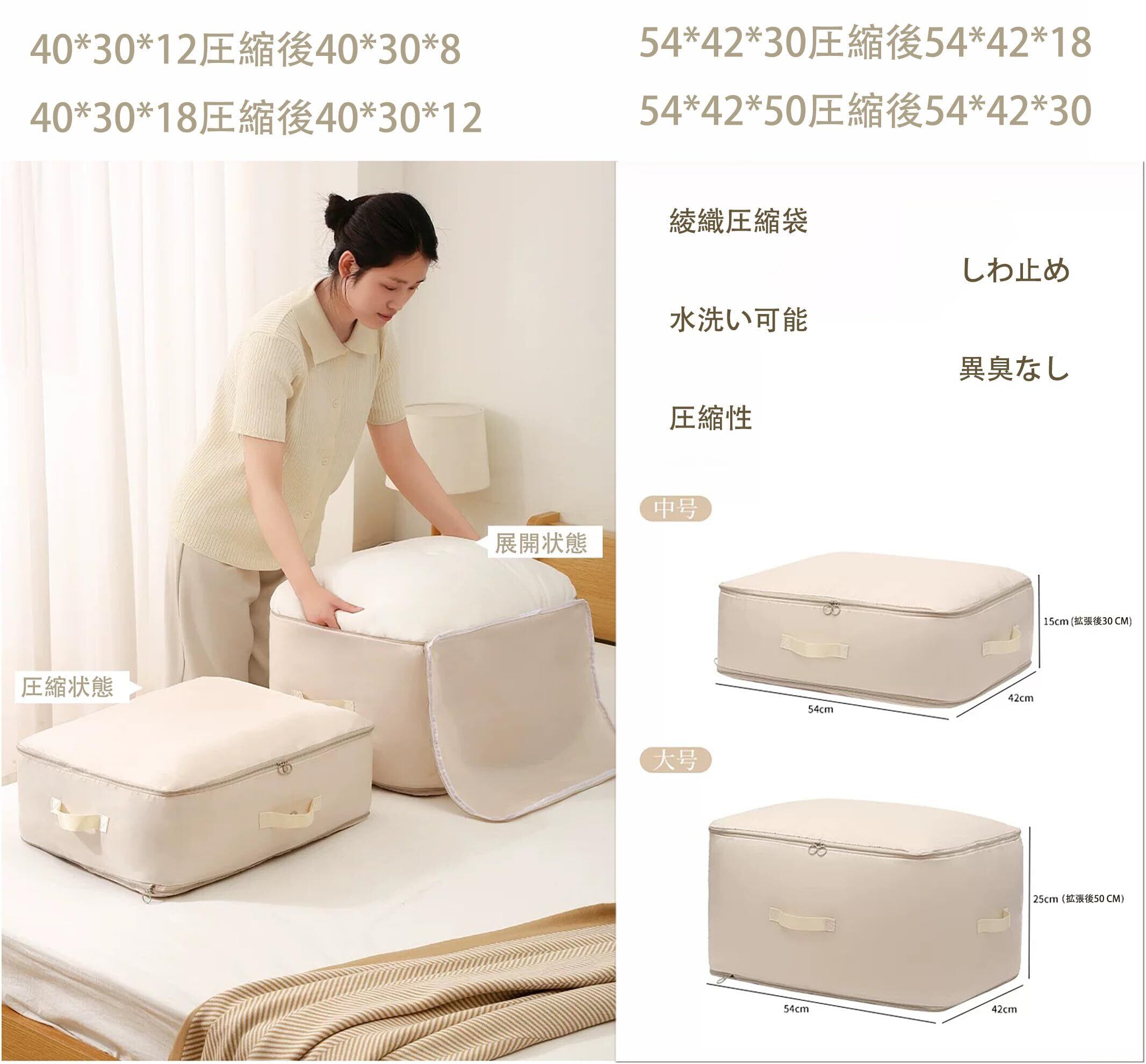 40*30*12 CM冬用のダウンジャケットや四季折々の掛け布団を2-3枚収納でき、 40*30*18にダウンジャケットや四季折々の掛け布団を3-5枚収納でき、 54*42*30 CMに冬の掛け布団を1枚収納でき、 50*42*50 CMに冬の厚手の掛け布団を1枚収納でき、 容量を減らすことができるだけでなく、クローゼットにきれいに収納でき、使わないときは折りたたんで収納袋に入れることができ、何度も繰り返し使用することができる 防水・防臭仕様,外からの湿気や汚れをブロックし、大切な衣類を清潔に保管。防水機能で水濡れからも衣服を守ってくれます。