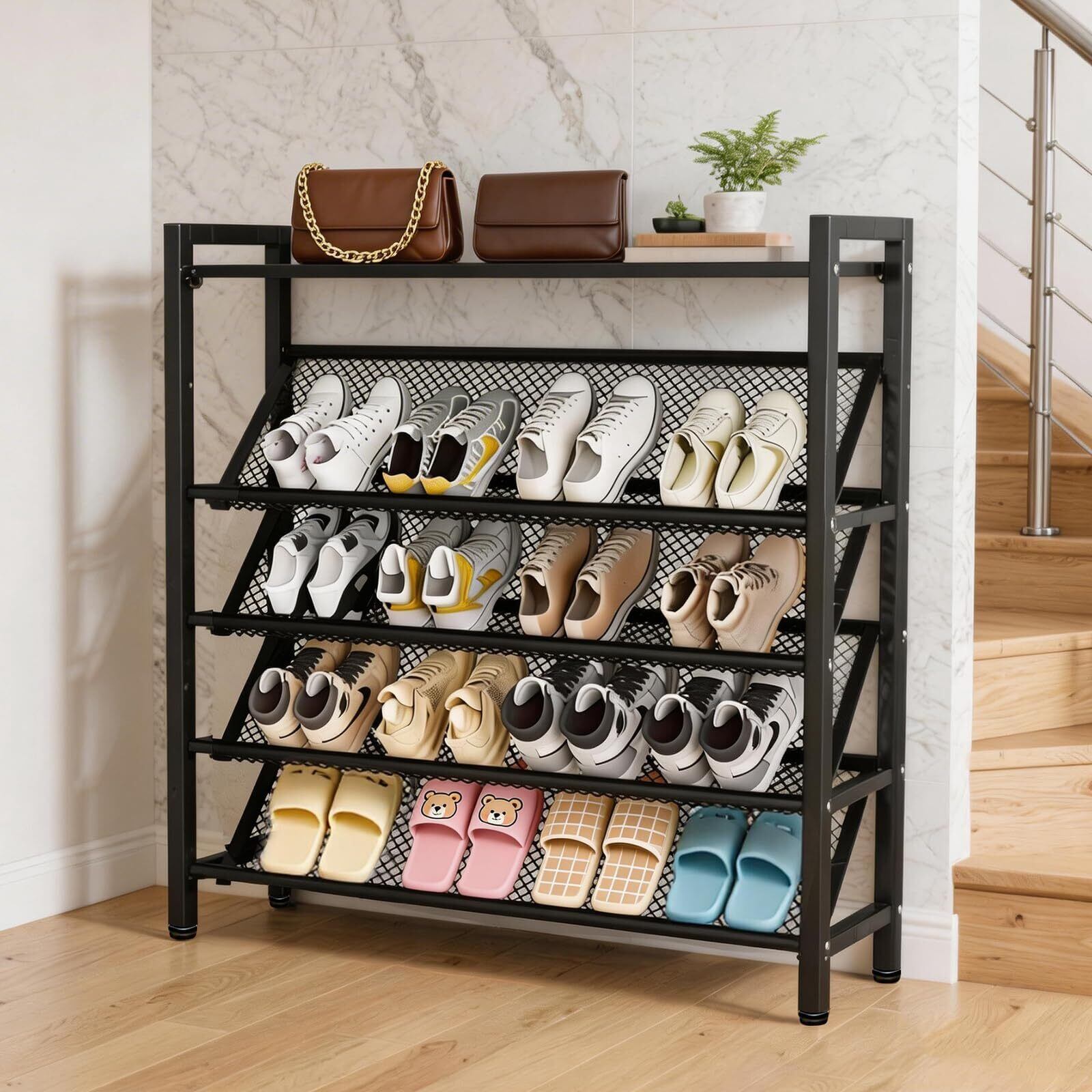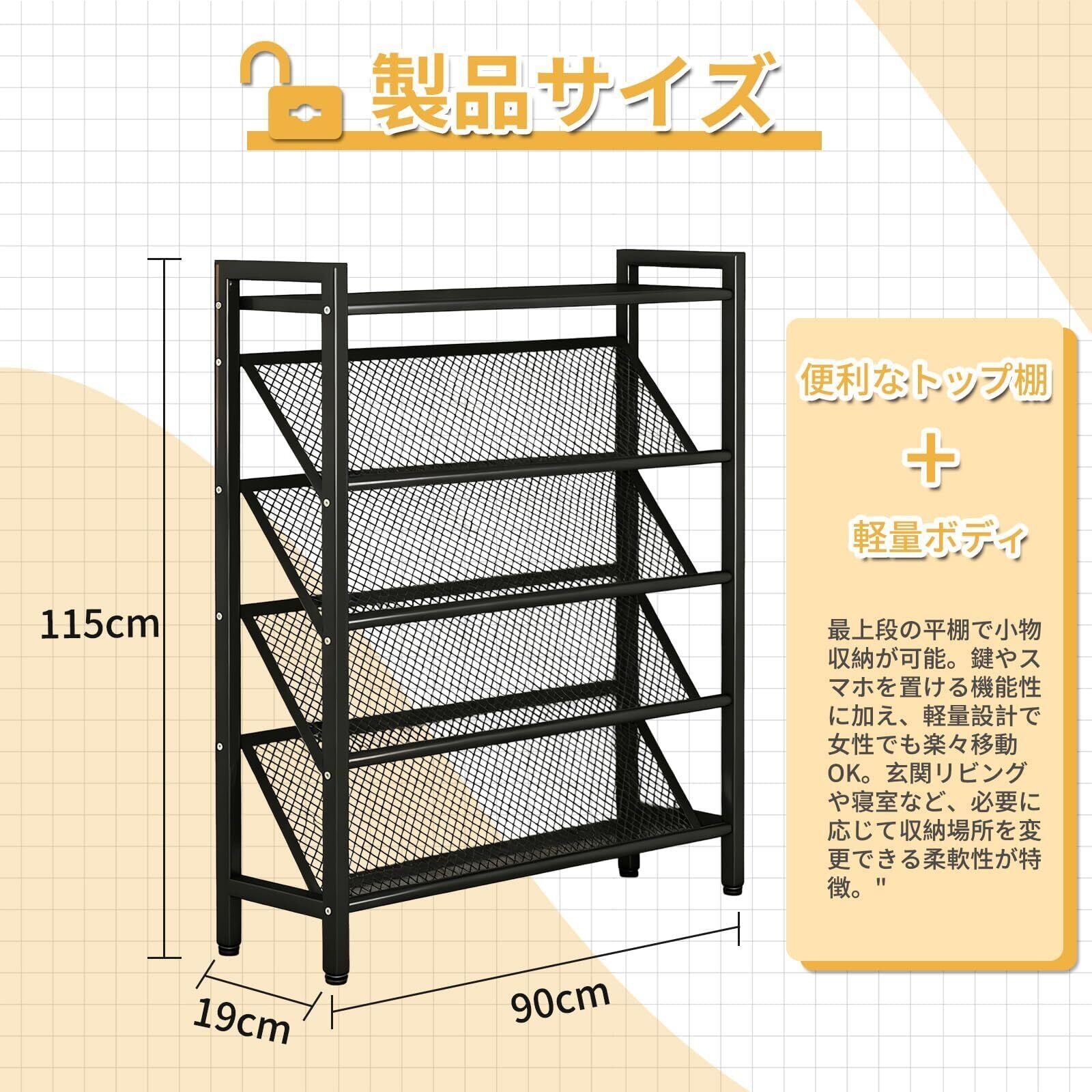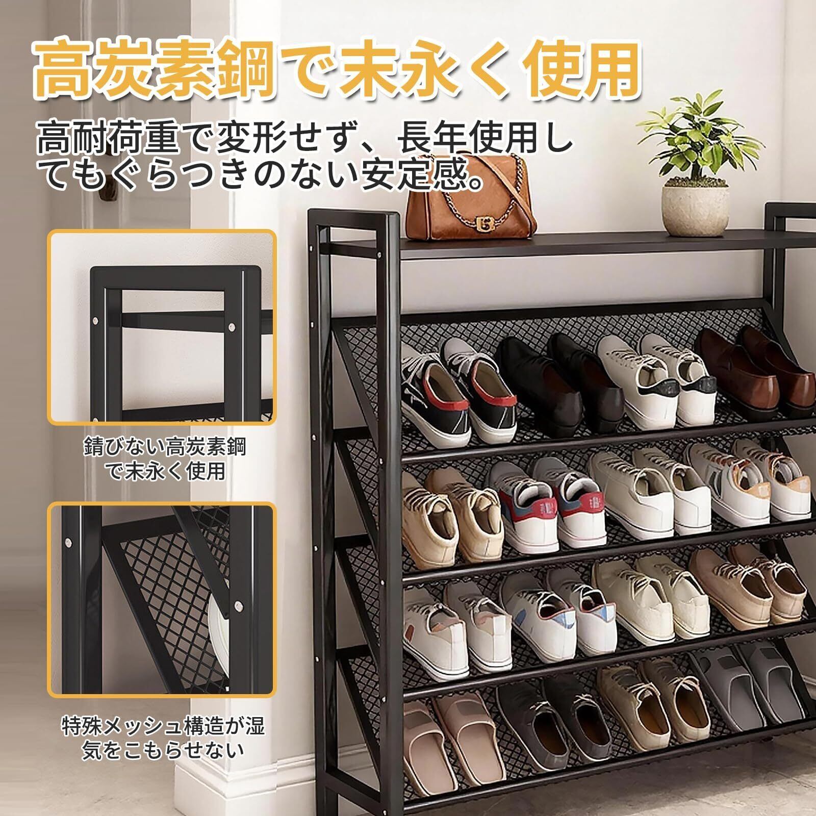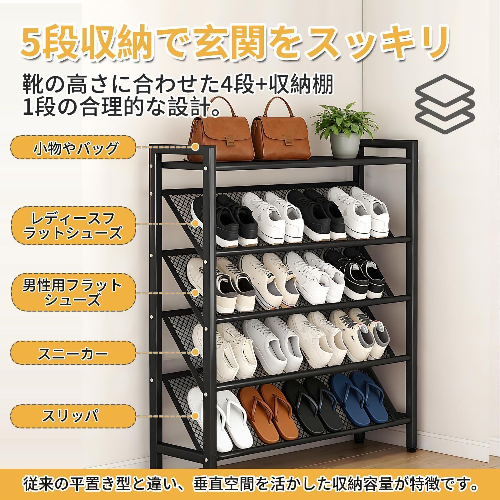 シューズラック 5段 最大18足の靴を収納可能 スリム薄型 組み立て簡単 丈夫で通気性良好 玄関/狭いスペースに最適 大容量収納 W90×D19cm 下駄箱 斜め置きデザイン 靴箱 収納棚 炭素鋼製 省スペース ブラック