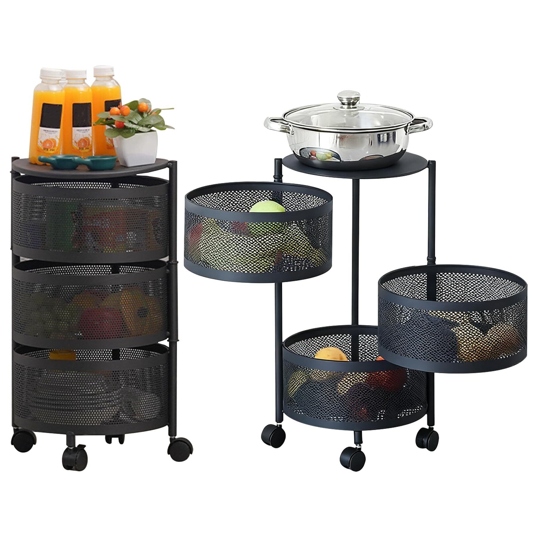 キッチンワゴン 収納ラック ワゴン キャスター付き 収納ボックス キッチン収納 可動 大容量 通気性 収納ワゴン 360°回転 台所 寝室 収納室 (黑い色, 円形3層)